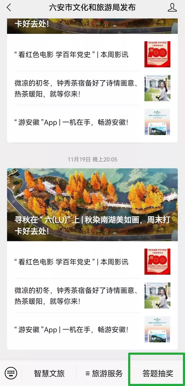 方法一:關(guān)注公眾號(hào)“六安市文化和旅游局發(fā)布”,點(diǎn)擊公眾號(hào)右下方“答題抽獎(jiǎng)”,進(jìn)入活動(dòng)頁面;