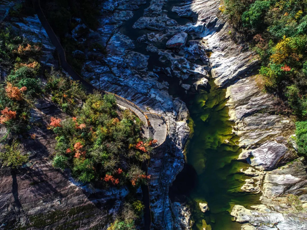 溫暖的陽光還停留在峽谷之中,山林里最后一批紅葉還傲然挺立在枝頭,鮮紅、碧綠與蒼黃,這并不調(diào)和的色調(diào),組成了別具一格的峽谷冬景。