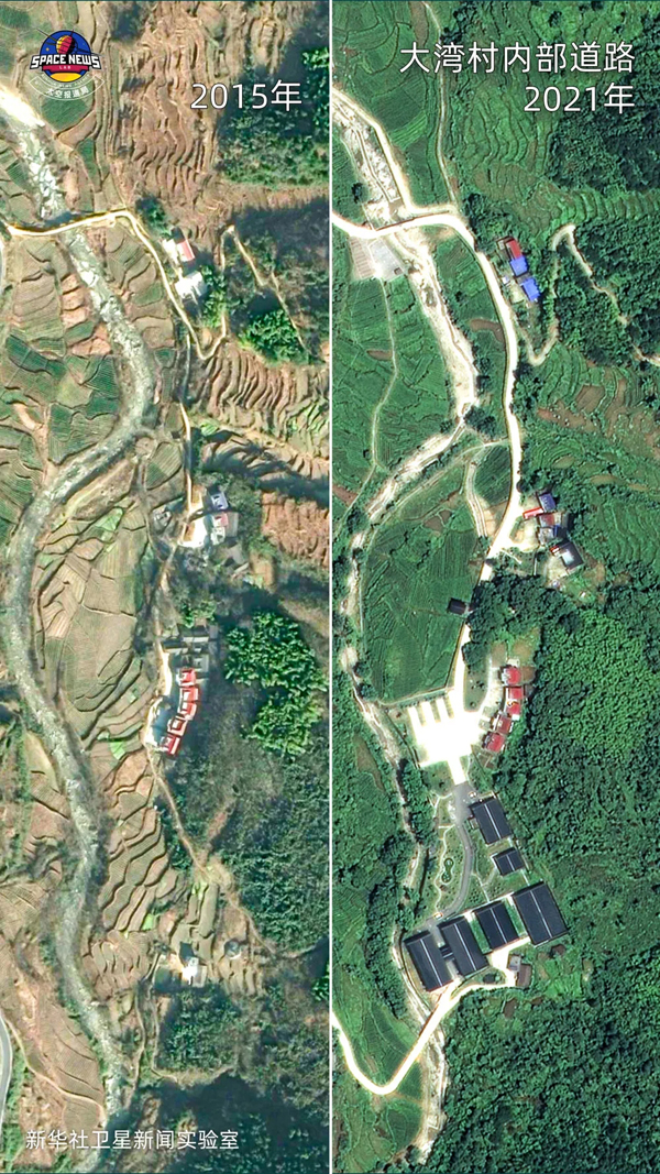 ▲衛(wèi)星捕捉到的大灣村基礎(chǔ)設(shè)施變化。與2015年零星的硬化路面相比,2021年大灣村內(nèi)部道路基本實(shí)現(xiàn)道路硬化全覆蓋,對之前較窄的道路進(jìn)行了擴(kuò)面延伸,居民出行更便捷。