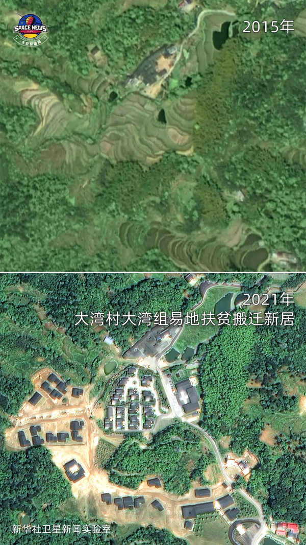 ▲衛(wèi)星見證了易地扶貧搬遷新居“從無到有”。大灣村共建設(shè)4個易地扶貧搬遷新居點(diǎn),搬遷群眾129戶439人。