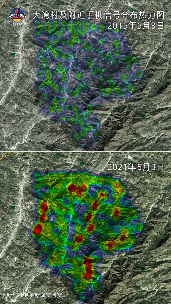 ▲有色區(qū)域代表手機(jī)信號,信號密度越大,顏色越深。與2015年相比,更大范圍、更密集的手機(jī)信號,反映出大別山區(qū)大幅增長的人流量。