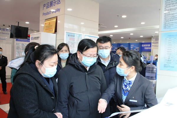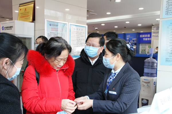 黑龍江省社保中心主任于占淮(中)在建設(shè)銀行哈爾濱香坊支行調(diào)研“就近辦”應(yīng)用情況