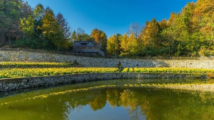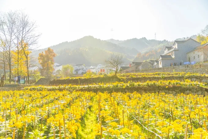 漫山疊翠與徽派民居相映成趣,金黃的鮮花裝點(diǎn)著白墻灰瓦。這里的村民不僅過上了新生活,還種起了菊花,山嶺間的這一抹金黃,令人感慨。