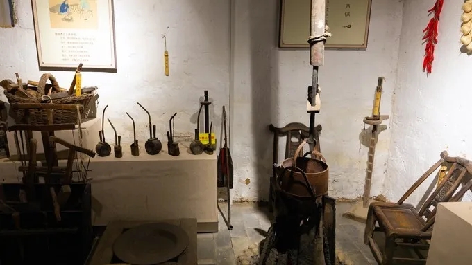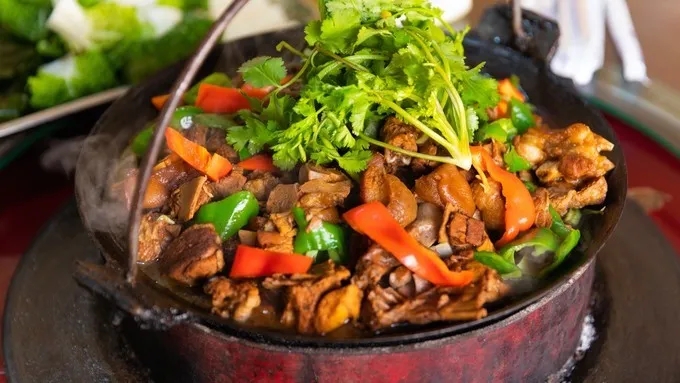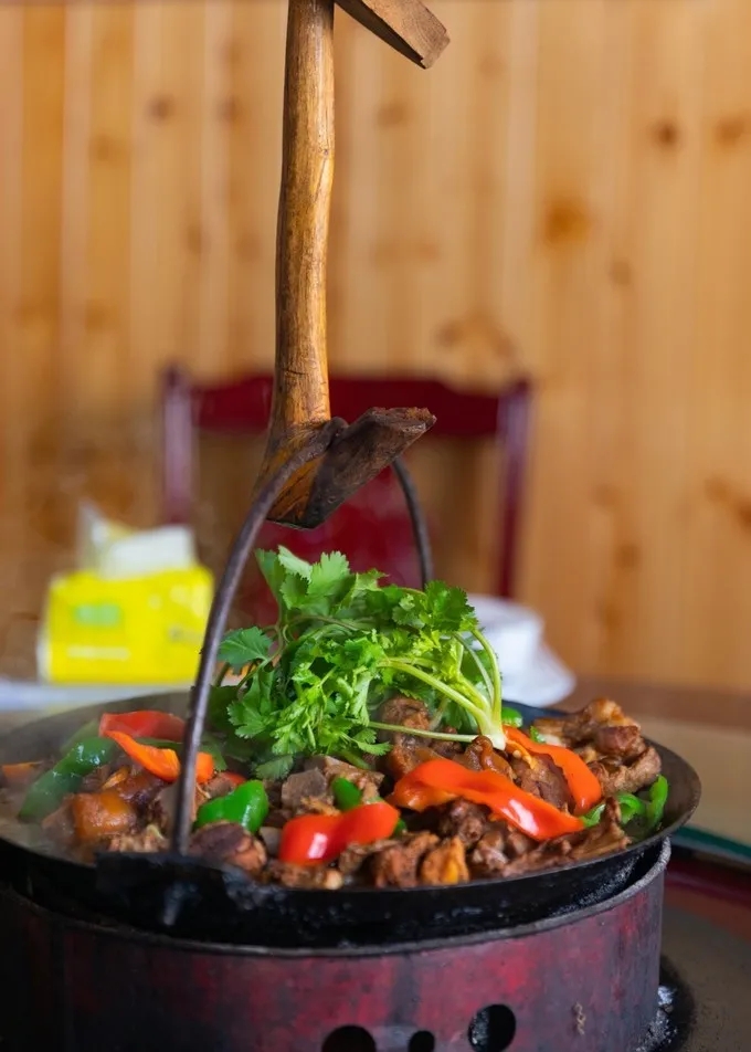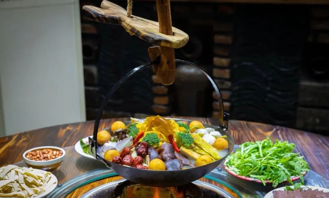 金寨吊鍋宴,金寨山區(qū)農(nóng)戶冬季燒樹根、木材取暖,在屋內(nèi)挖一直徑50~70厘米,深約20厘米的火籠,同時(shí),在屋梁上懸木質(zhì)滑竿吊一鐵鍋,在火籠上可以調(diào)節(jié)升降。