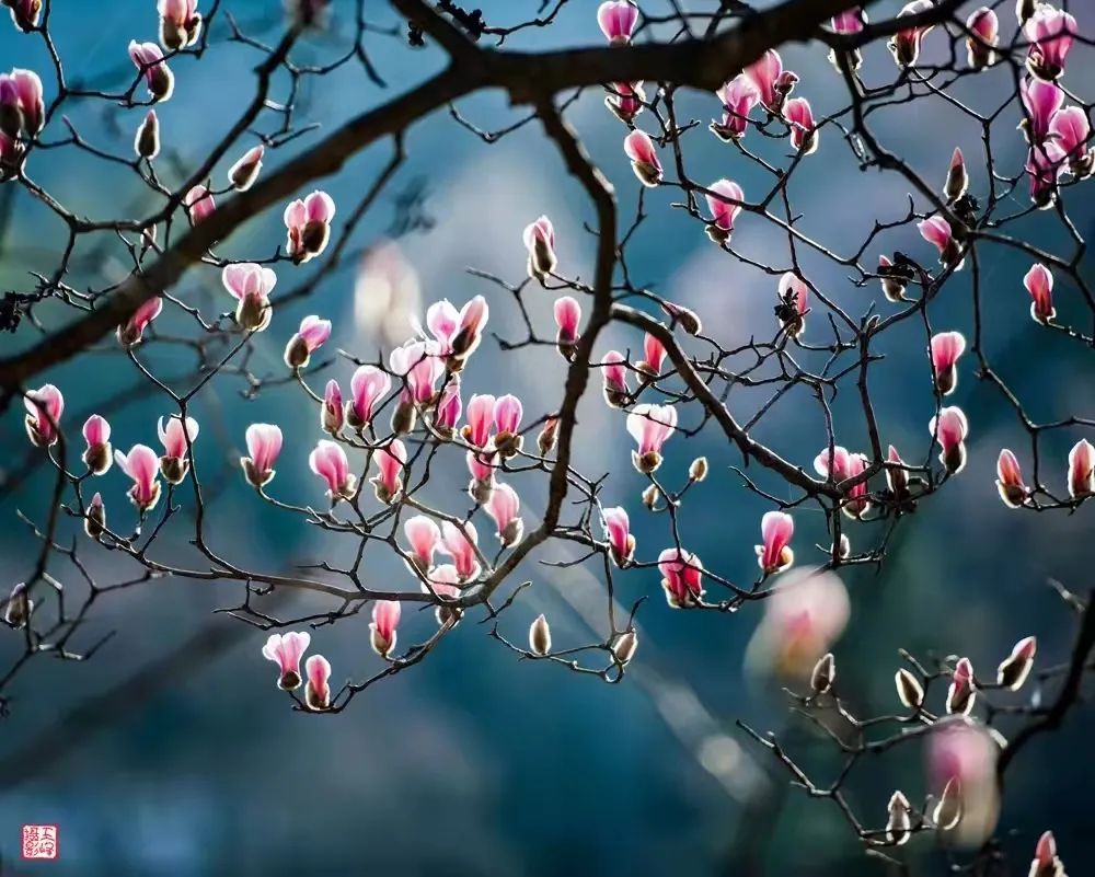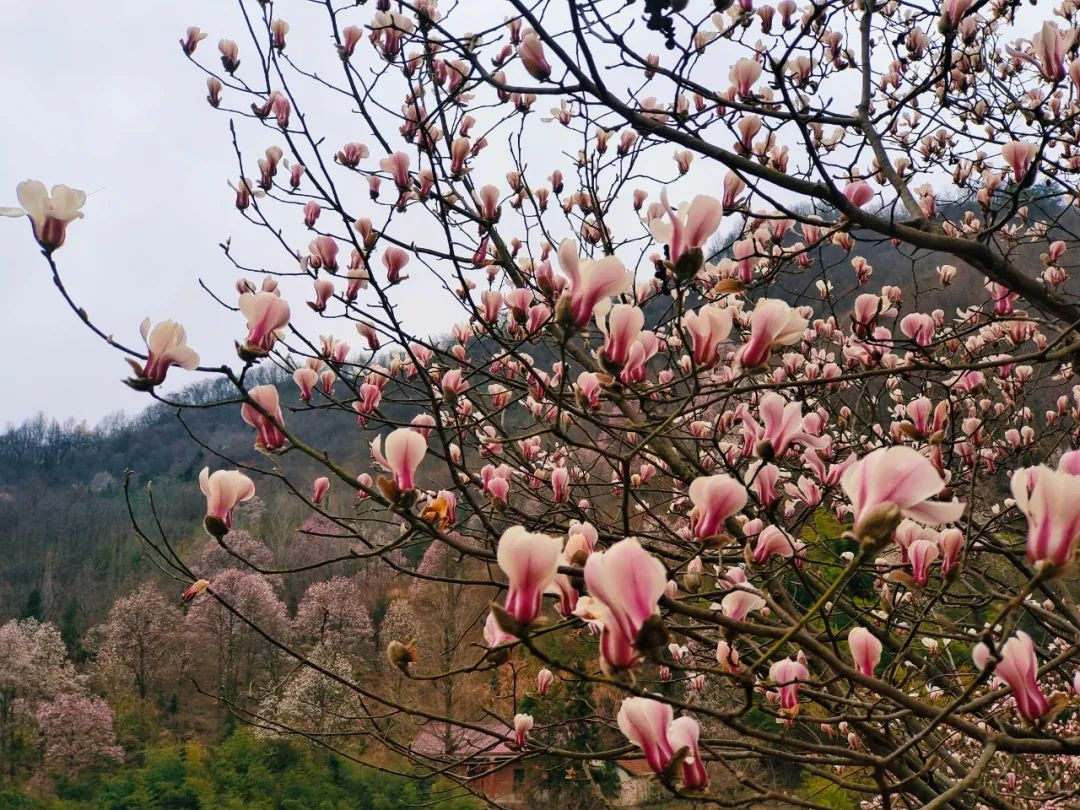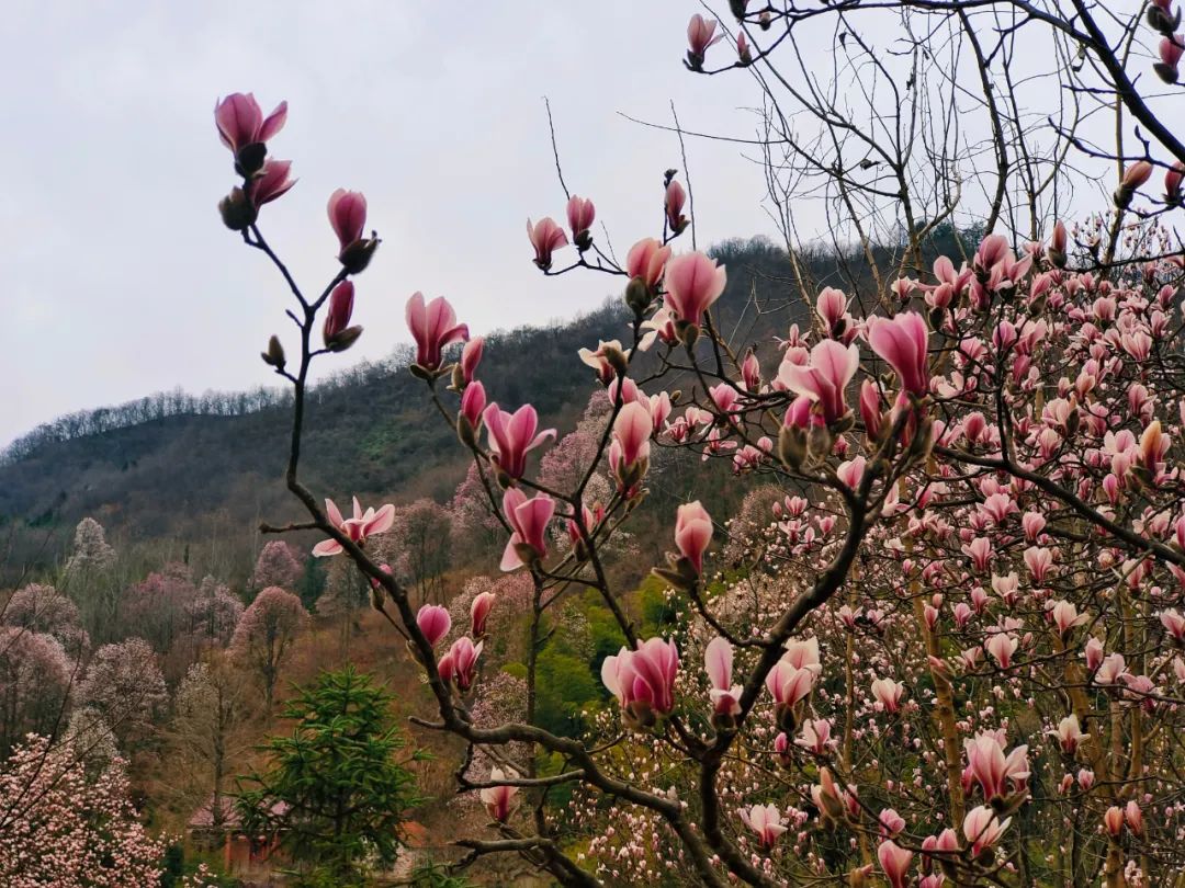 不同于我們常見(jiàn)的望春花樹(shù),這些生于大山之中的野生望春花樹(shù)大多有了上百年的樹(shù)齡,枝繁葉茂,開(kāi)起花來(lái)不是一小叢一小片,而是遮天蔽日地綻放出花朵。這里的望春花多為白色,間或粉紫,遠(yuǎn)遠(yuǎn)望去只見(jiàn)一樹(shù)素潔勝白雪,大團(tuán)大團(tuán)的花朵猶如冰清玉潔的仙子翩然而來(lái),陣陣香氣沁人心脾,引得游人陶醉不已。粉紫望春花,更是一樹(shù)粉嫩如絳云,宛若穿著霓虹羽衣的仙子,衣袂飄飄,婀娜多姿。這亦真亦幻之感,令人陶醉不已!