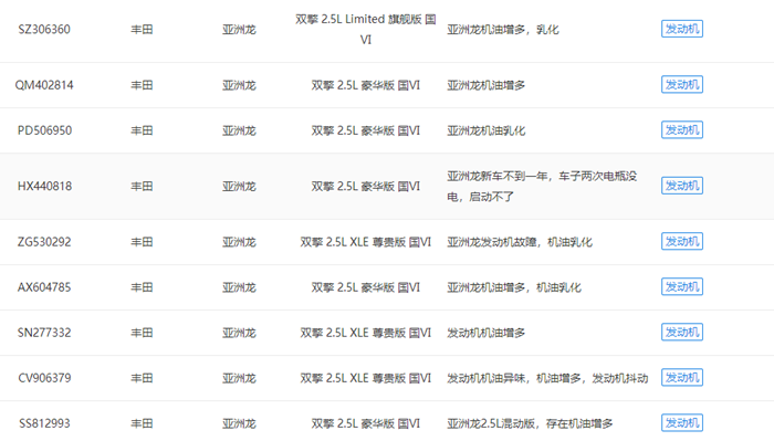 與此同時,在中國網(wǎng)汽車質(zhì)量投訴平臺上,一汽豐田2019款亞洲龍2.0L燃油版也被爆出“發(fā)動機連續(xù)無故熄火、故障燈亮起”的故障。而更早時候,一汽豐田亞洲龍則被異響以及“機油增多”等問題纏身。實際上,自2019年上市后不久,亞洲龍就頻繁出現(xiàn)天窗異響、車內(nèi)異響、中控異響等問題,也引發(fā)了大量車主的投訴。同時,冬季雙擎車型“機油增多”的問題,更引發(fā)外界強烈關(guān)注。主要是因為發(fā)動機反復在冬季無法充分暖機的狀態(tài)下使用時,發(fā)動機內(nèi)少量的結(jié)露水不能蒸發(fā),且混入到發(fā)動機機油里,使得發(fā)動機無法獲得充分潤滑,由此引發(fā)了車主們對發(fā)動機使用壽命的擔憂,紛紛要求豐田為雙擎車輛發(fā)動機提供延長質(zhì)保年限服務,但最終并未予以采納。