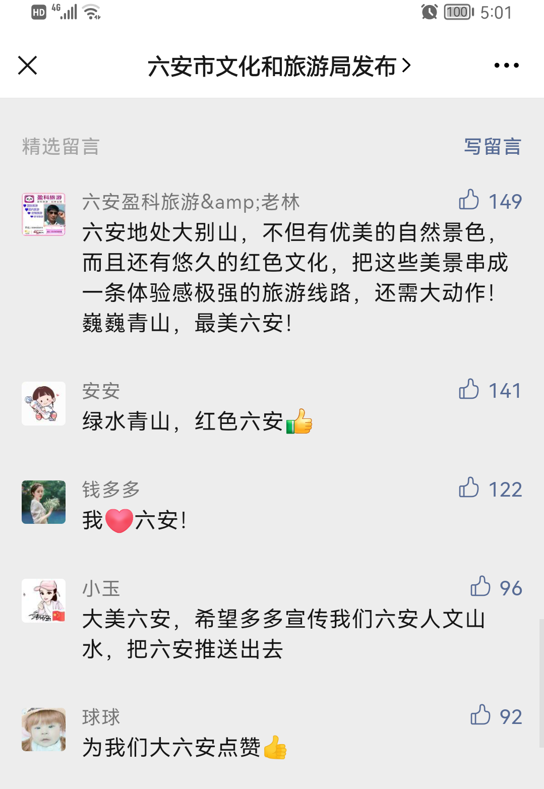為回饋廣大網(wǎng)民朋友,六安市文旅局公眾號(hào)舉辦了“文末留言送六安文旅大禮包”活動(dòng)。