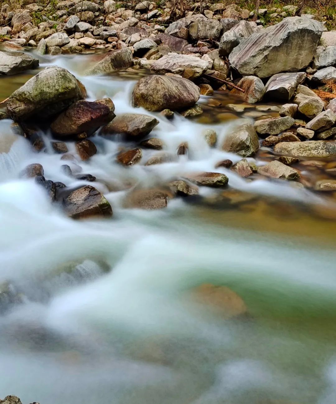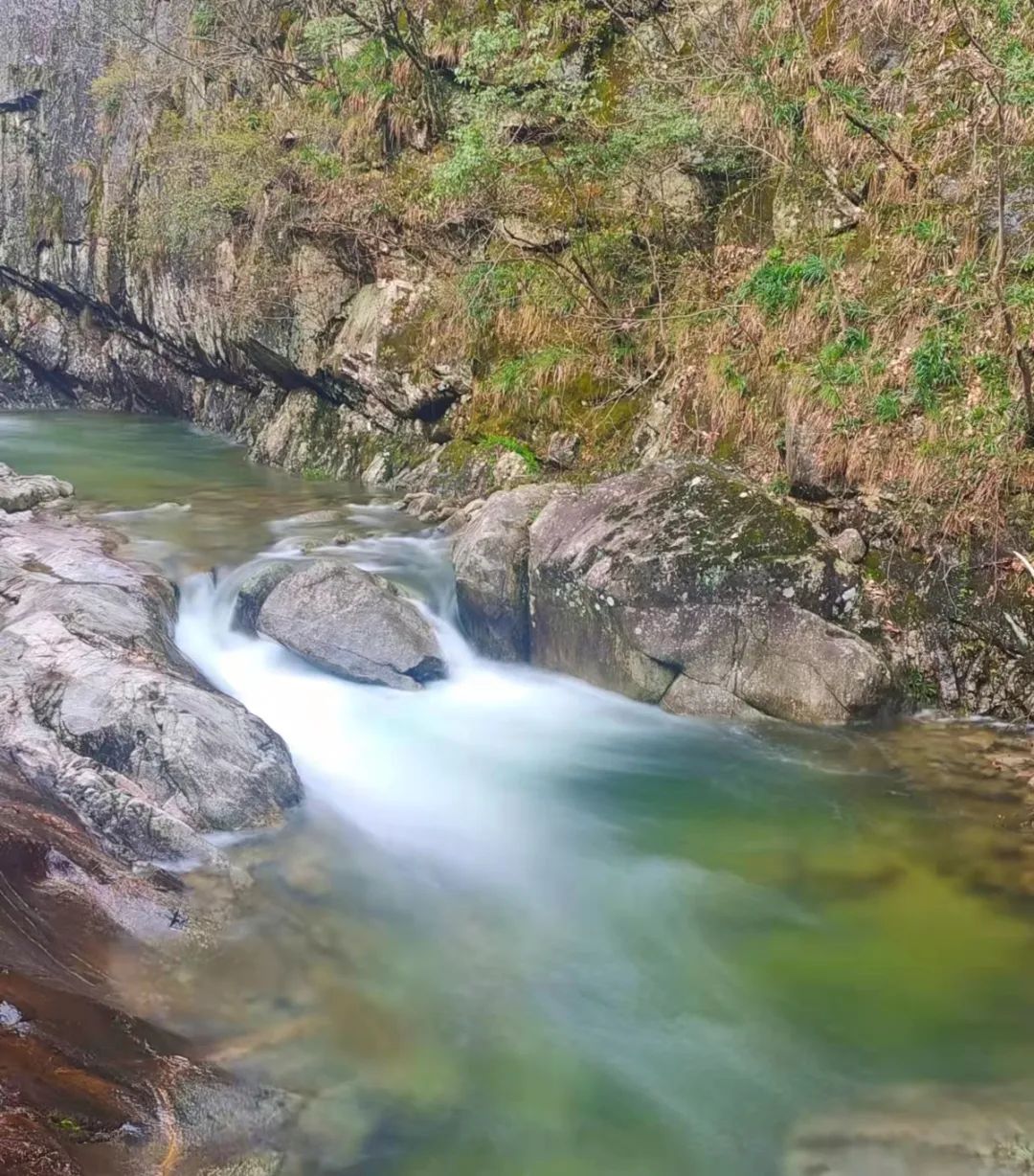 這一片靜謐的世界正在耳邊細語,恍惚而縹緲,呼吸著山林散發(fā)的溫潤氣息,一邊走,一邊聽到水聲越來越近,溝澗出現(xiàn)在眼前,大約十米寬的河流,充盈著水汽,掩映之中,不時有奇石撞進眼簾,山岳大都以石為骨,水之媚,有石焉,累累然而多。大,小,方,圓,袤尺不一,色澤蒼潤,有了石的滋養(yǎng),春的沉凝,這灣水也有了不一樣的清澄和寧靜,水流不大也不急,行止健穩(wěn),既不嘩眾取寵,也不狂放囂張,那份嫻靜,那股柔婉,恰是我心目中絕佳的女性的秉質(zhì)。
