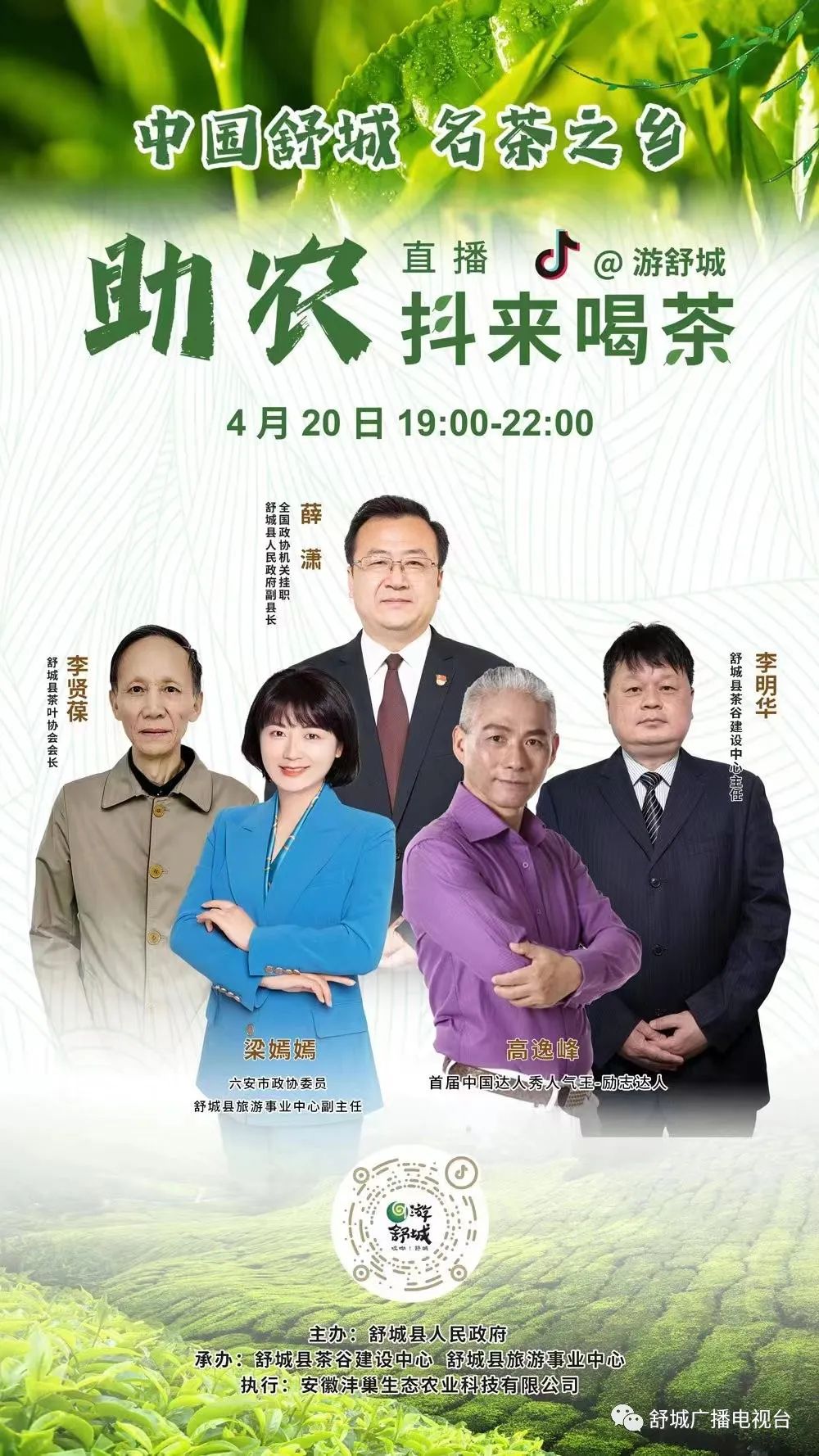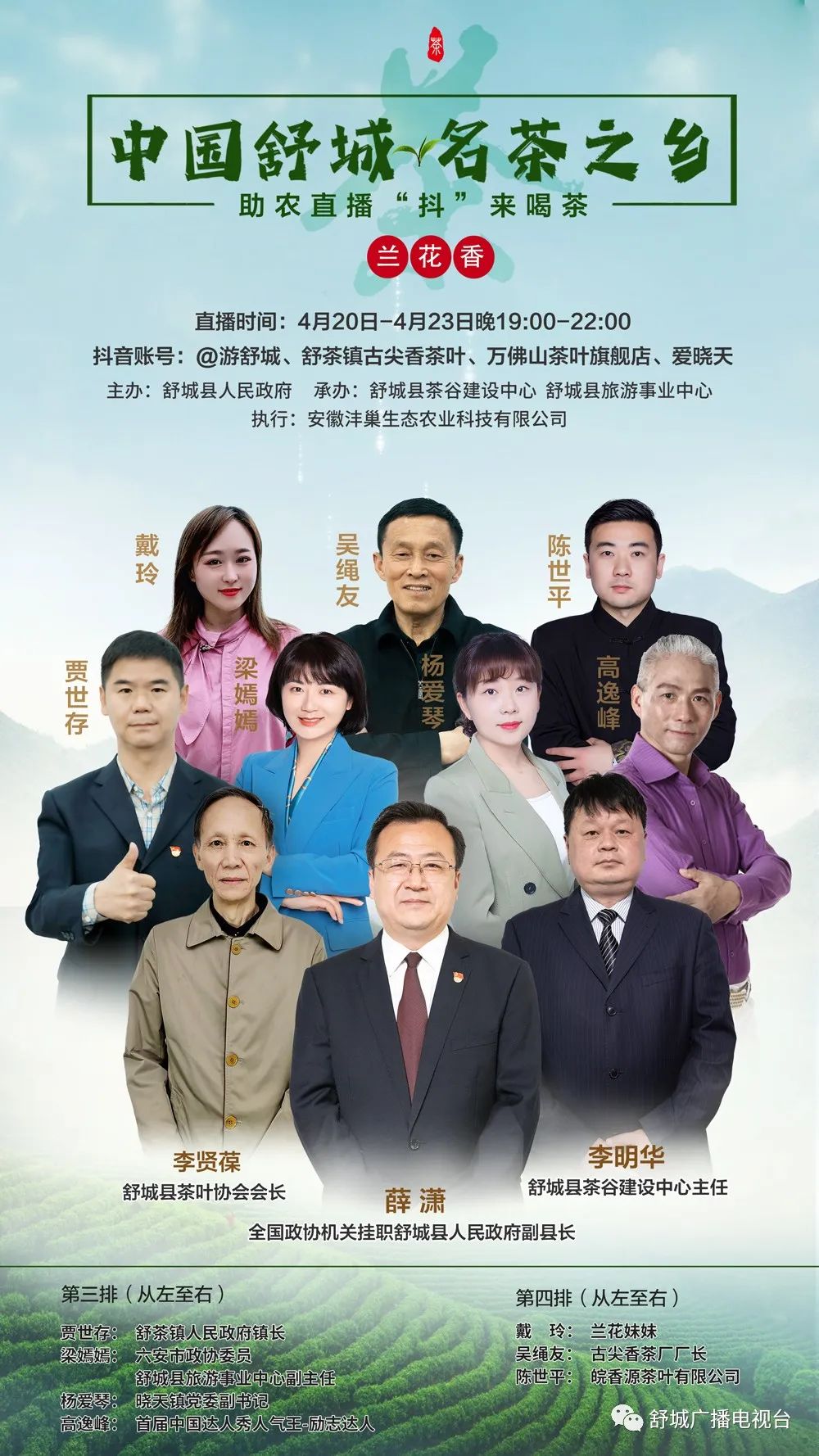 4月20-4月23日晚7點(diǎn)-10點(diǎn),誠(chéng)邀您進(jìn)入抖音直播間(“@游舒城”、“舒茶鎮(zhèn)古尖香茶葉”、“萬(wàn)佛山茶葉旗艦店”、“愛(ài)曉天”),與您:同賞萬(wàn)佛山水秀,共品舒城蘭花香!