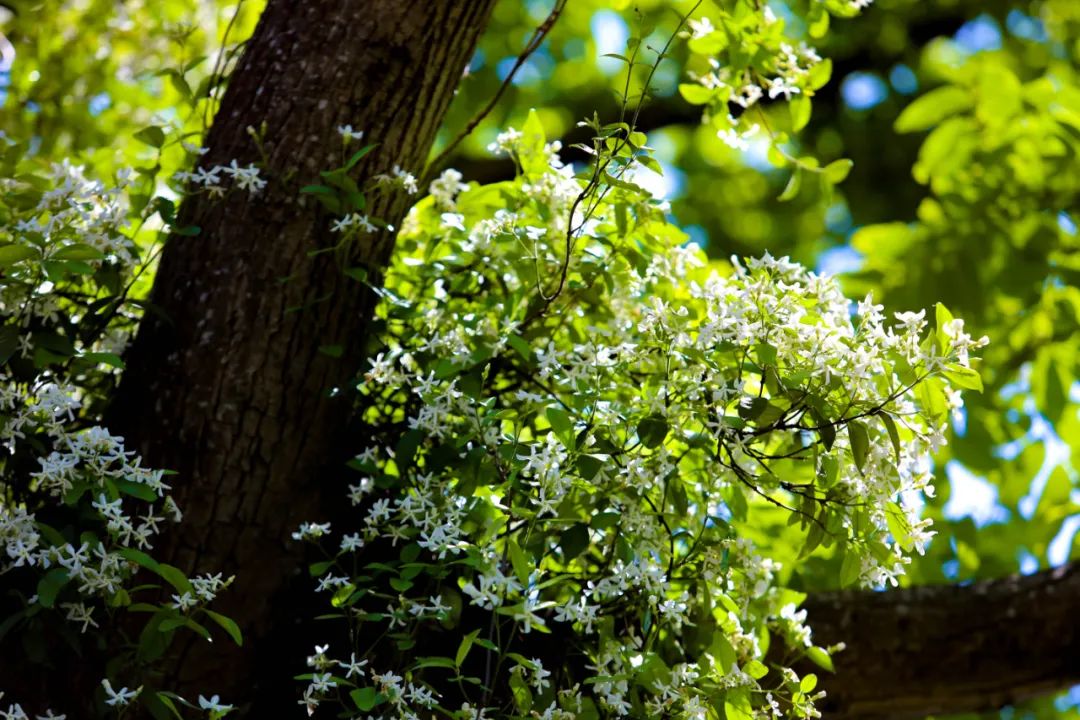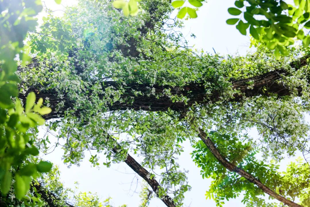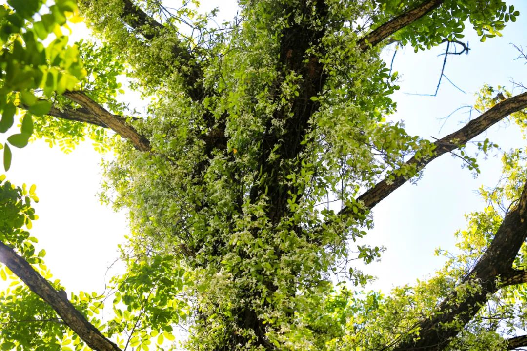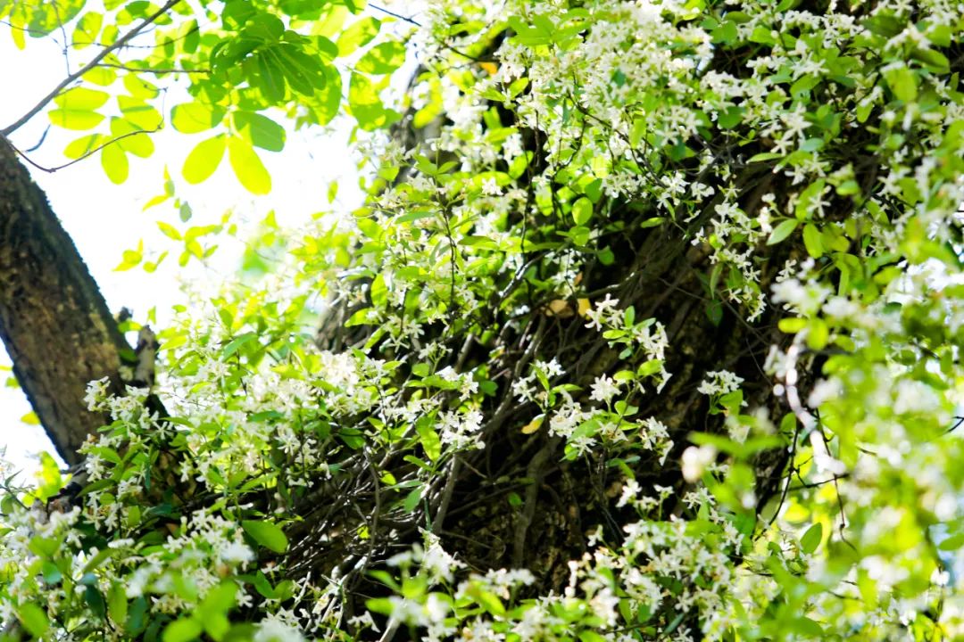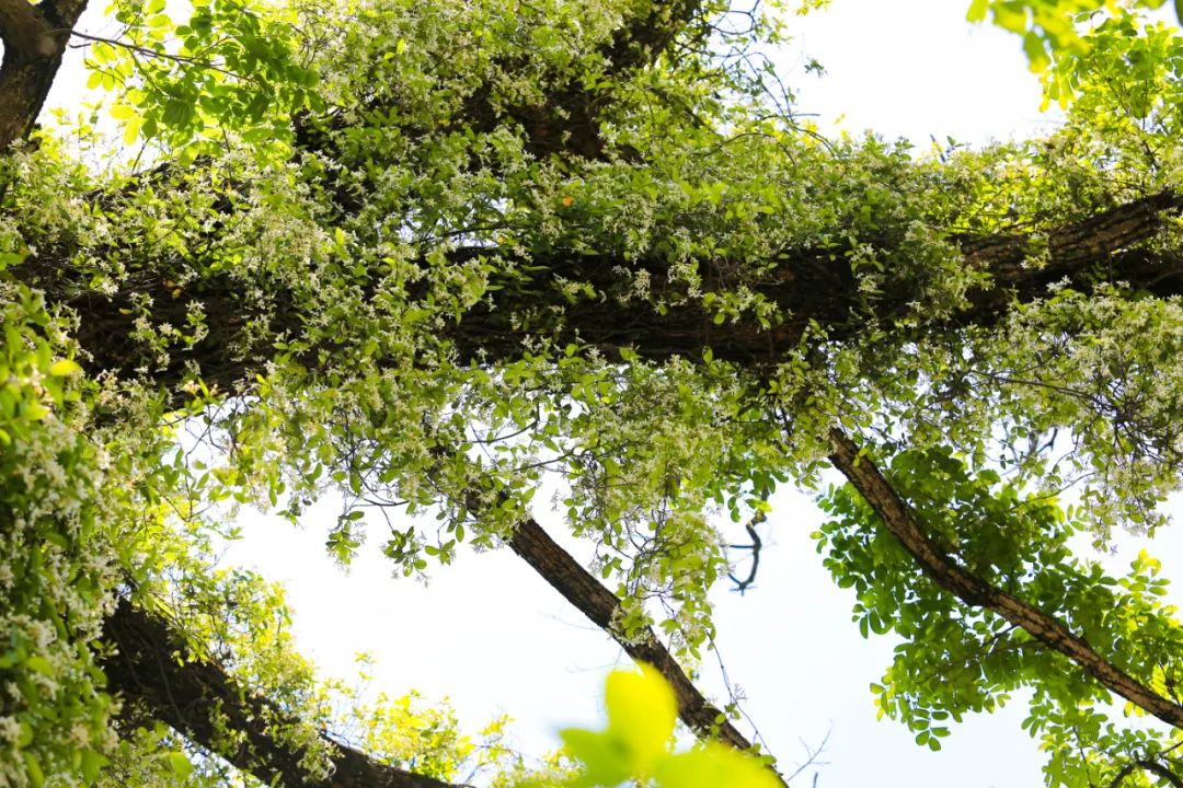 這棵古樹有上百年的歷史,樹身周長(zhǎng)約2米,兩人合抱猶不可及,樹皮突兀嶙峋,似山谷、似空壑,花藤攀沿樹干向上生長(zhǎng),包裹著樹的枝杈,親密無(wú)間,入骨纏繞,相互融合。古柳樹杈間藤蔓交織在纏繞在黑色樹干上,陽(yáng)光透過(guò)繁密的罅隙,灑落一地的濃蔭和碎花,新綠染過(guò)的樹葉漸青,為春天送行。