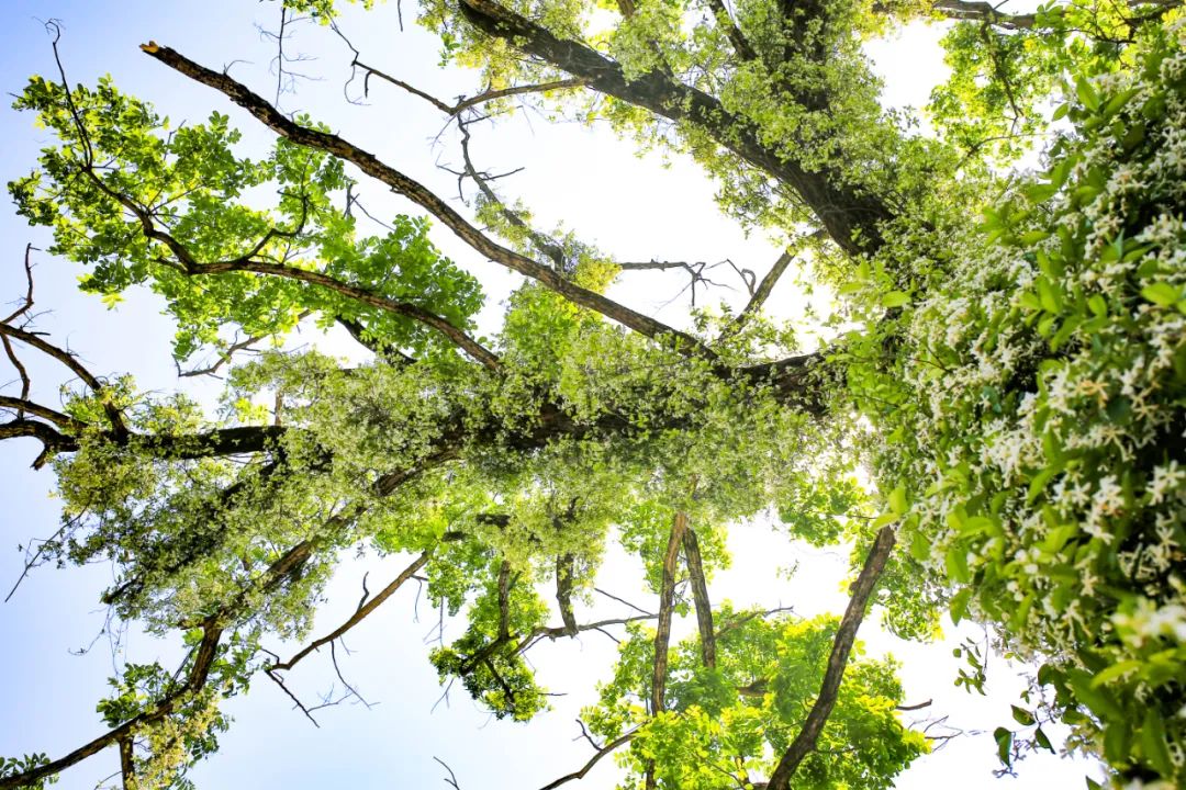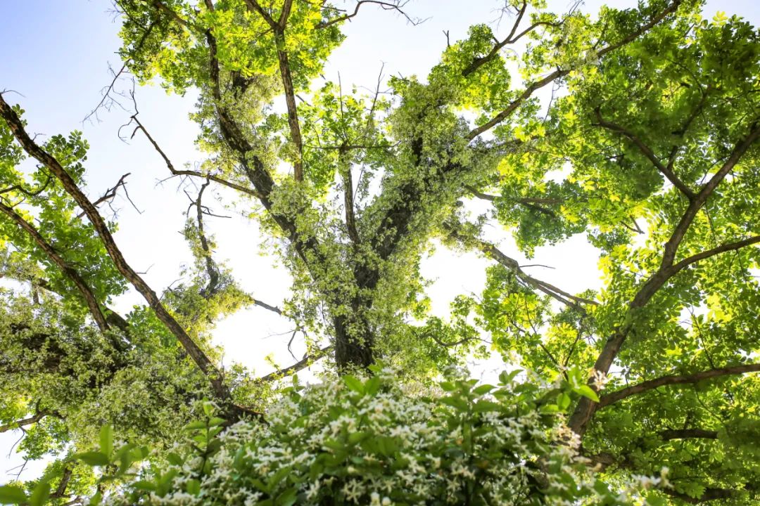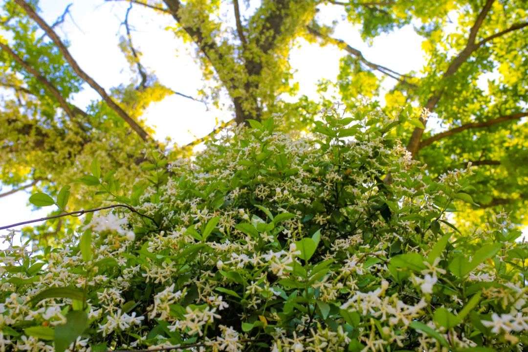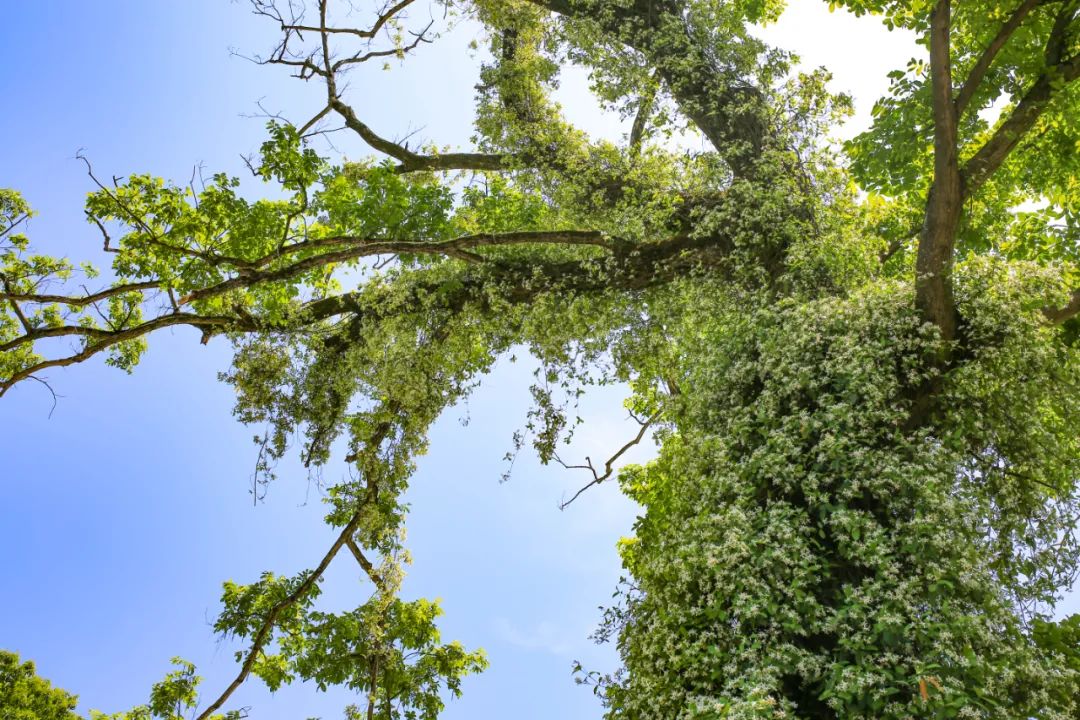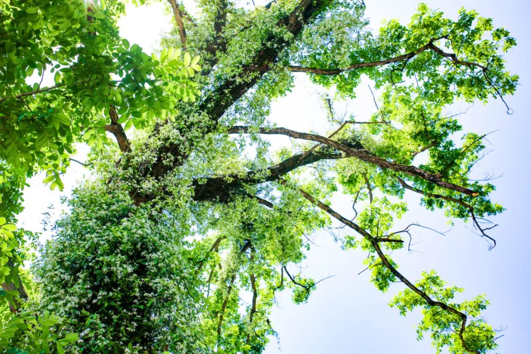 這棵古樹有上百年的歷史,樹身周長(zhǎng)約2米,兩人合抱猶不可及,樹皮突兀嶙峋,似山谷、似空壑,花藤攀沿樹干向上生長(zhǎng),包裹著樹的枝杈,親密無(wú)間,入骨纏繞,相互融合。古柳樹杈間藤蔓交織在纏繞在黑色樹干上,陽(yáng)光透過(guò)繁密的罅隙,灑落一地的濃蔭和碎花,新綠染過(guò)的樹葉漸青,為春天送行。