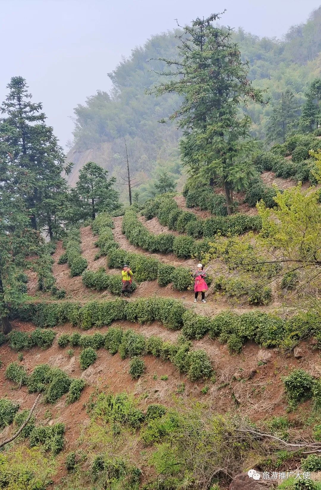 在回程的路上,我發(fā)現(xiàn)每一處茶園的周圍都有竹林,松樹,以及各色不知名的花草,一些桃樹、杏樹也星星點(diǎn)點(diǎn)散落在茶園四周,茶樹種植并不密集,看上去稀稀拉拉,周圍的植物有時候遠(yuǎn)遠(yuǎn)多于茶樹。