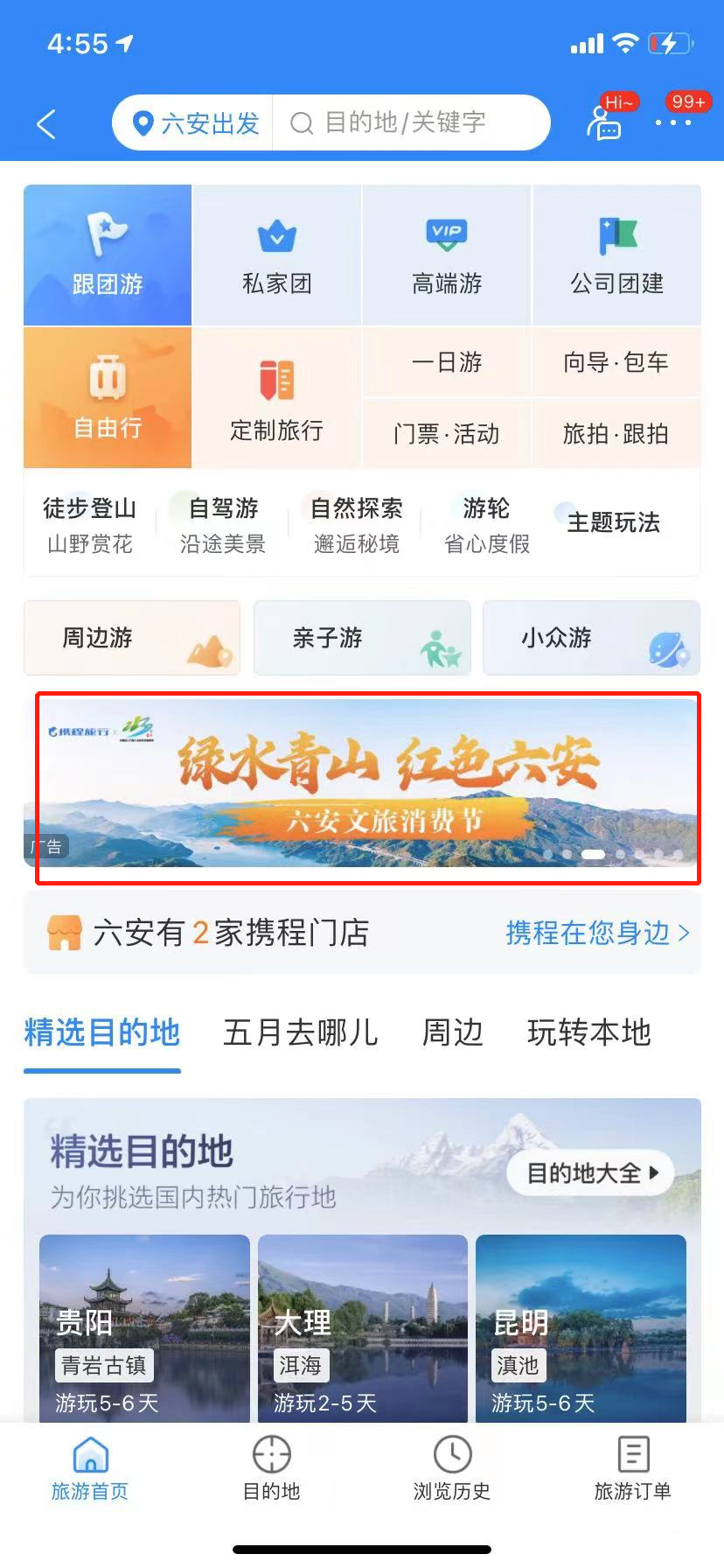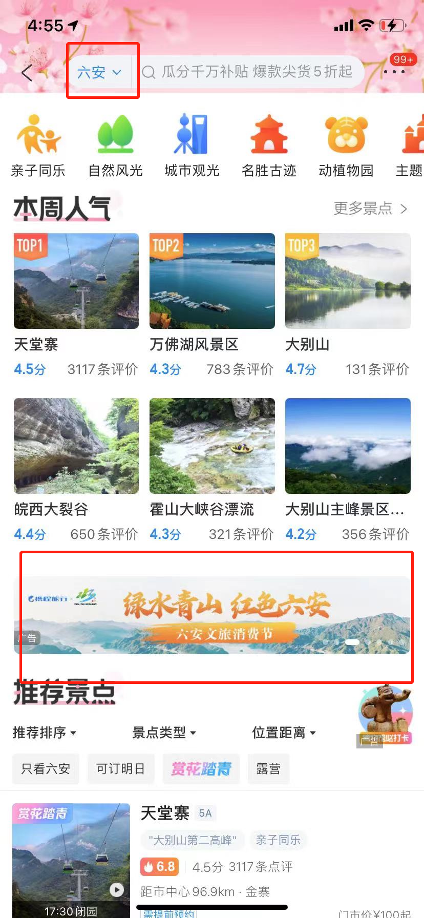 自5月18起,攜程將利用其APP平臺的高曝光主題頁面設(shè)置高流量入口,點(diǎn)擊帶“六安”二字的廣告位進(jìn)入相關(guān)頁面,均可領(lǐng)取優(yōu)惠券。