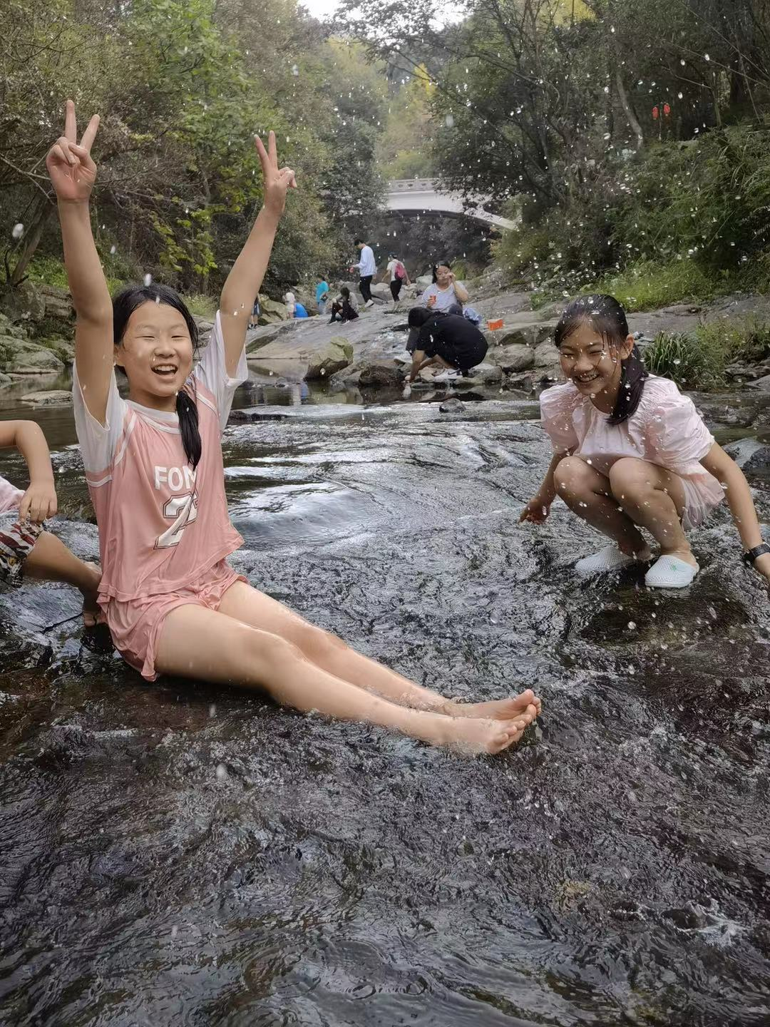 小朋友在十里溪嬉戲玩鬧,這里充滿了歡聲笑語,是親子游玩的好地方。