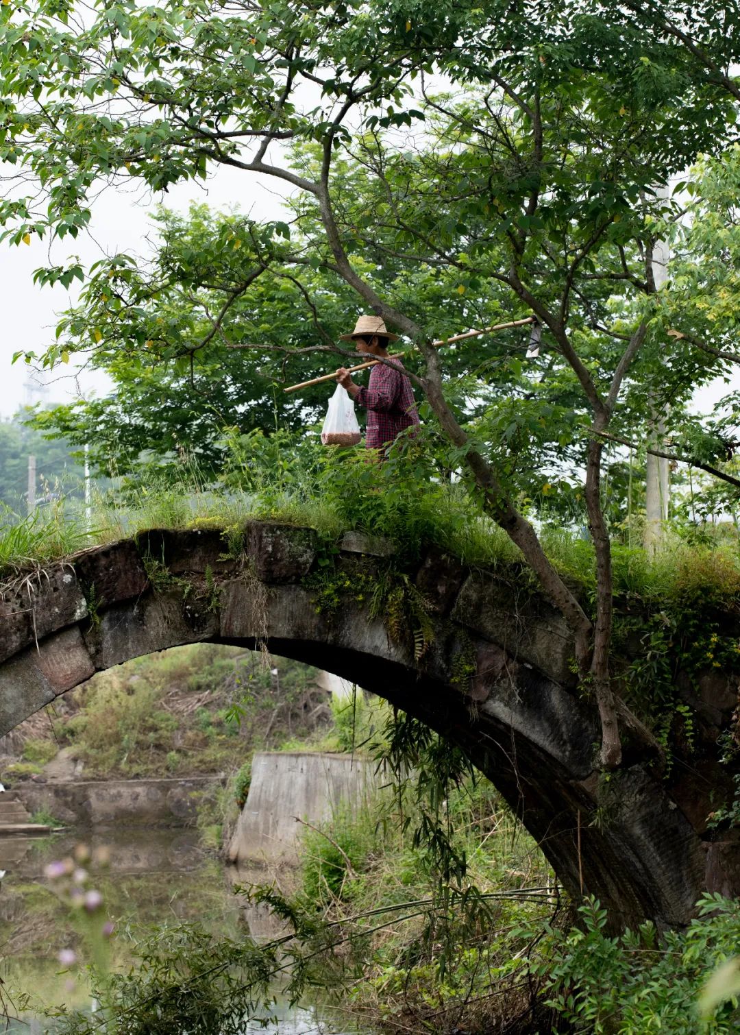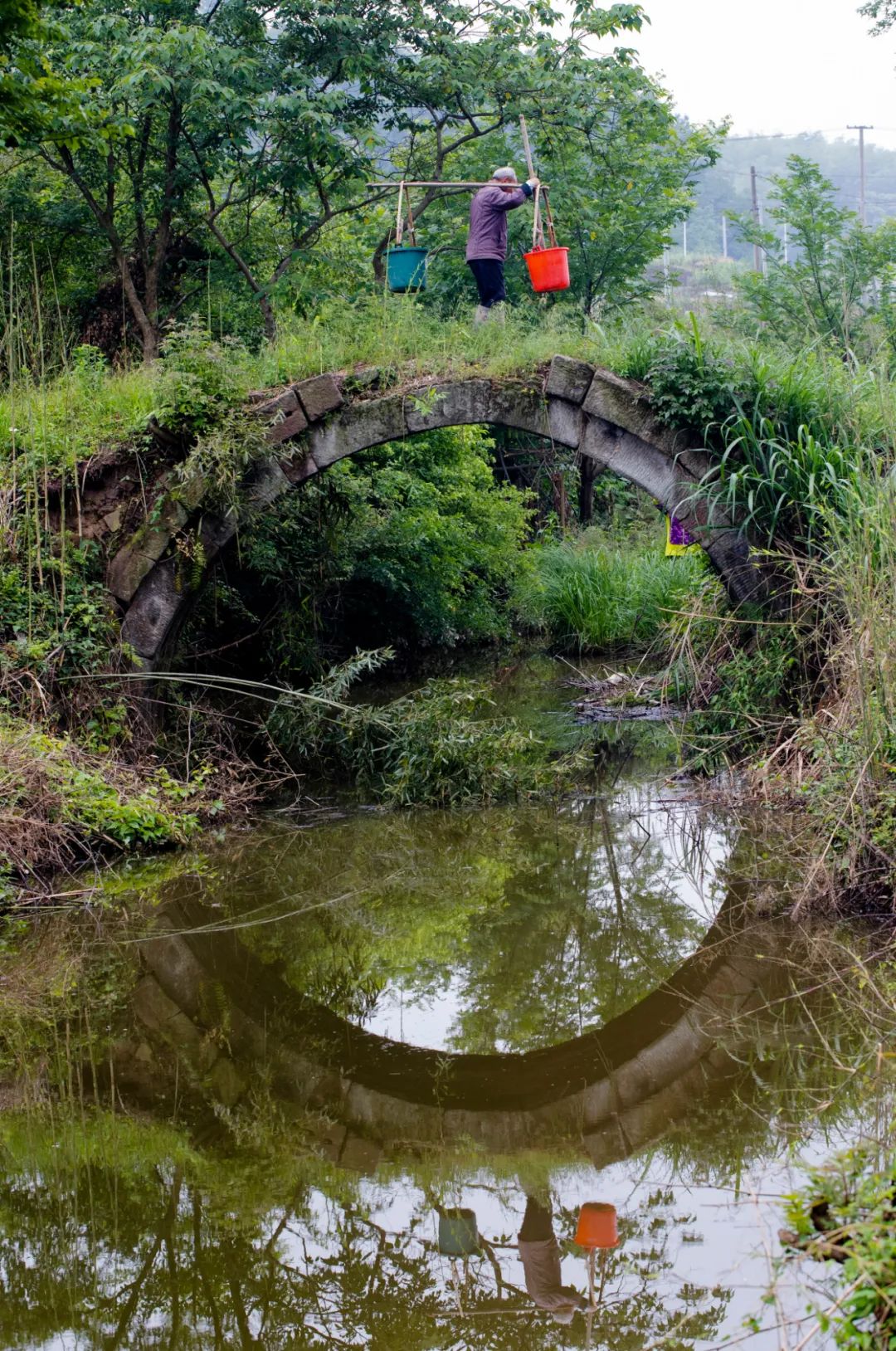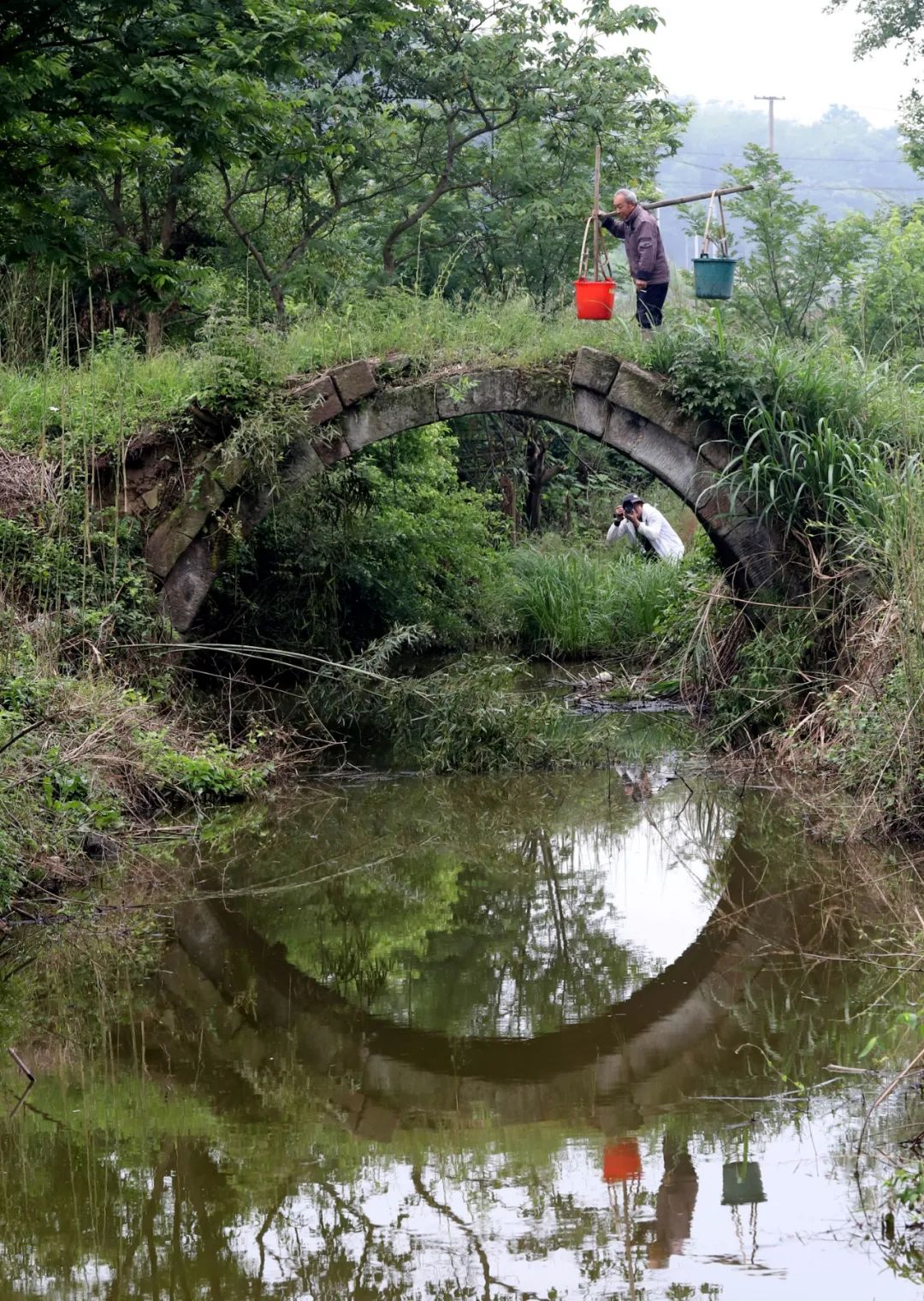 即便瘦成這樣的橋,依然很結實,一塊塊石頭咬合著,巍然不動。我們第三次去的時候,村里已經(jīng)安排人砍了雜草,整座橋的真面目才顯出來,橋是半圓型,與水里的倒影合起來,就是一個完整的圓。我們靜等著,等勞作的人從橋上經(jīng)過,好拍一張照片。當扛著鋤頭的婦人經(jīng)過時,分明有江南的味道;當挑擔子的老農(nóng)過來時,溪水流淌著詩意。