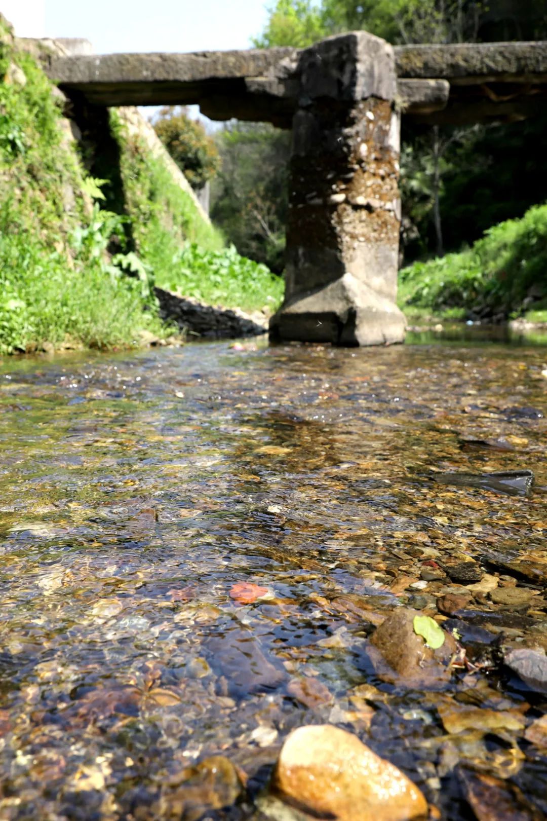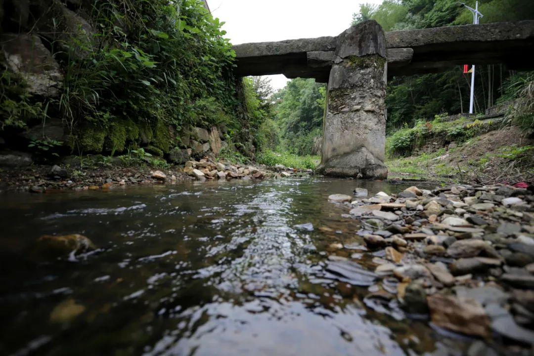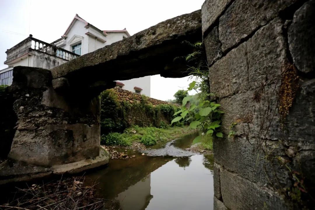 即便瘦成這樣的橋,依然很結實,一塊塊石頭咬合著,巍然不動。我們第三次去的時候,村里已經(jīng)安排人砍了雜草,整座橋的真面目才顯出來,橋是半圓型,與水里的倒影合起來,就是一個完整的圓。我們靜等著,等勞作的人從橋上經(jīng)過,好拍一張照片。當扛著鋤頭的婦人經(jīng)過時,分明有江南的味道;當挑擔子的老農(nóng)過來時,溪水流淌著詩意。