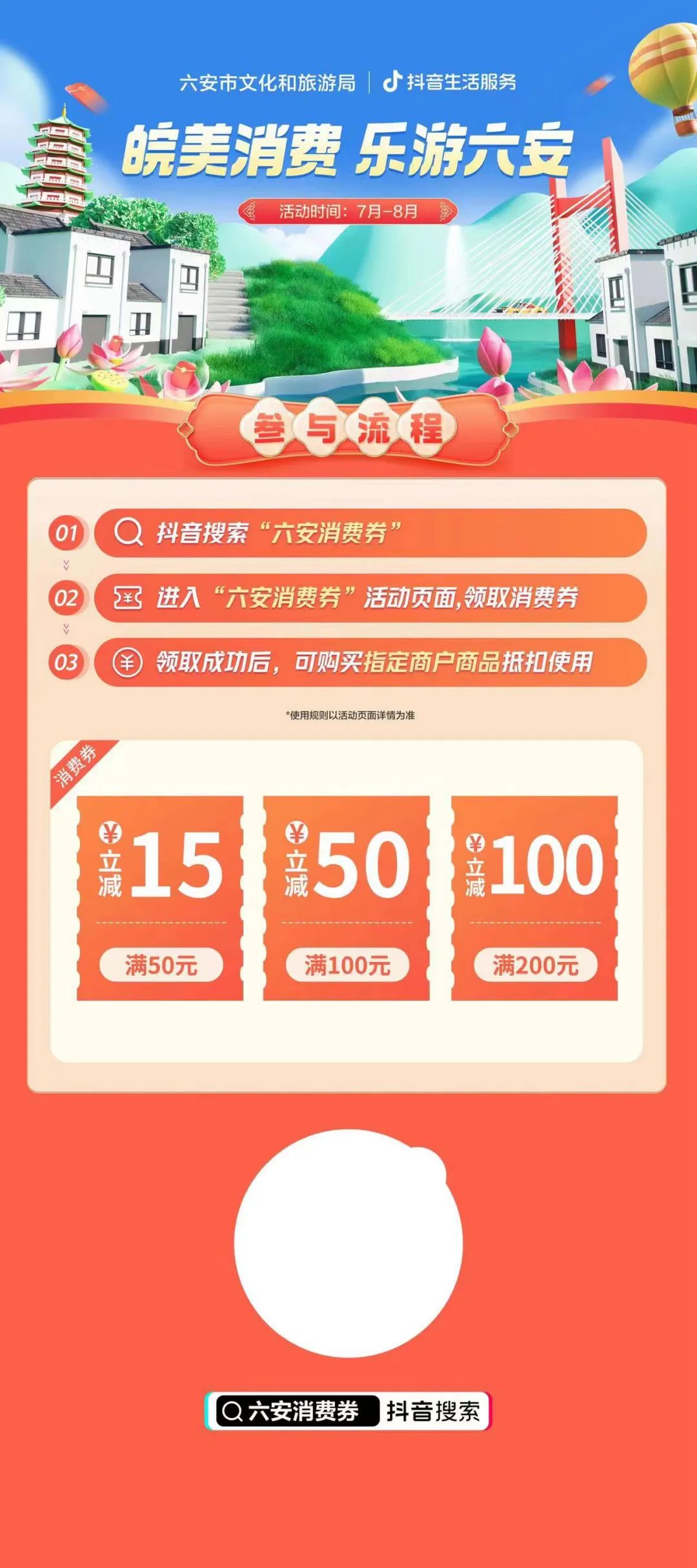 (責(zé)任編輯:君君)支付寶平臺(tái)300萬元六安文旅消費(fèi)券日前已發(fā)放完畢,抖音平臺(tái)260萬元文旅消費(fèi)券也要來啦!第一輪160萬元將于7月5日晚8點(diǎn)開始發(fā)放!本次發(fā)放的消費(fèi)券主要用于符合條件的景區(qū)、景點(diǎn),有效期截至7月31號(hào)晚12點(diǎn)。