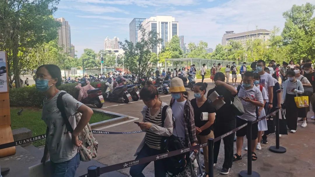 這是近期圖書館門口每天早上等候排隊入館的畫面,2022年7月13日起讀者等候入館開啟清涼模式啦?。?!