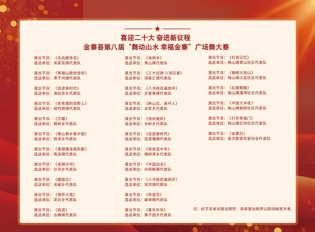 今年七月,中共安徽省委宣傳部、安徽省文化和旅游廳聯(lián)合下發(fā)關(guān)于開展2022年安徽省廣場(chǎng)舞展演活動(dòng)的通知,為進(jìn)一步滿足城鄉(xiāng)居民美好文化生活需求,在全省營造迎接宣傳貫徹黨的二十大的良好氛圍,定于2022年7月至9月在全省組織開展2022年全省廣場(chǎng)舞展演活動(dòng),堅(jiān)持以人民為中心,聚焦新時(shí)代偉大實(shí)踐、偉大成就,通過廣場(chǎng)舞展演活動(dòng),引導(dǎo)城鄉(xiāng)群眾跳出幸福新生活、舞出健康新風(fēng)貌,激發(fā)廣大群眾熱愛黨、熱愛祖國、熱愛社會(huì)主義的熱情。