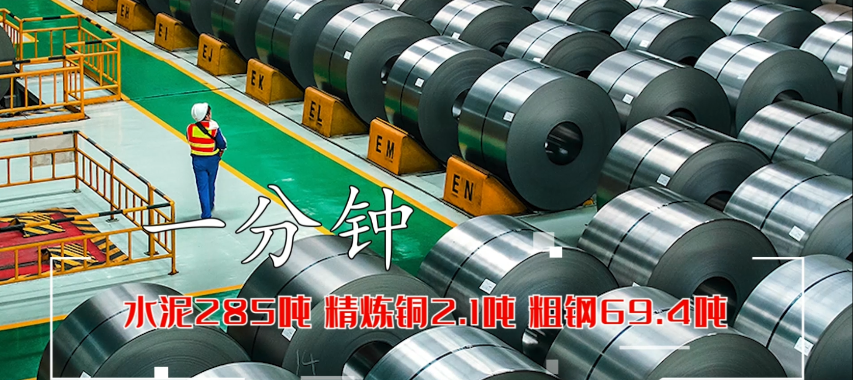 一分鐘,水泥285噸,精煉銅2.1噸,粗鋼69.4噸;