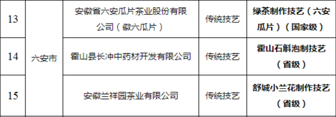 省文化和旅游廳發(fā)布了省級非遺工坊名單,經(jīng)各市推薦申報、專家評審、會議審定和公示,36家單位為省級非遺工坊,六安市3家單位入選,具體內(nèi)容如下: