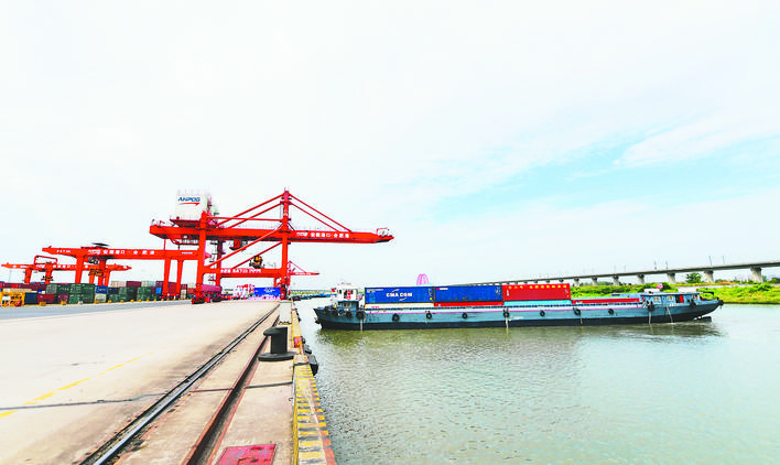 9月21日,在合肥港國際集裝箱碼頭,滿載叉車的集裝箱船駛離港口。