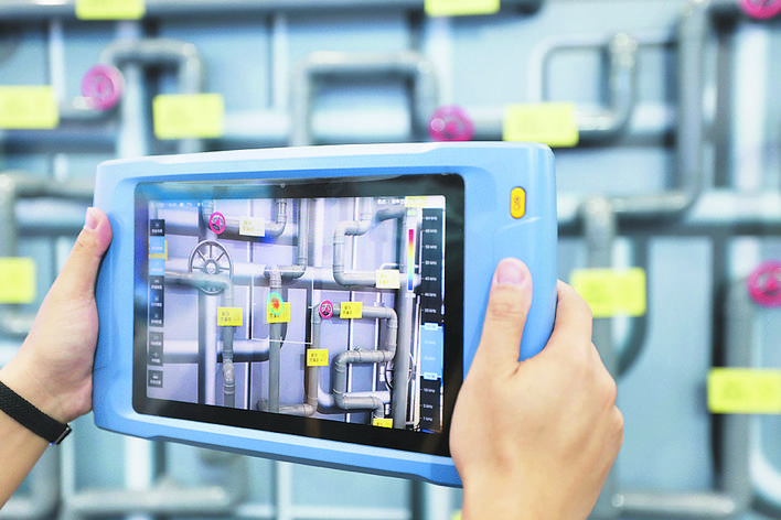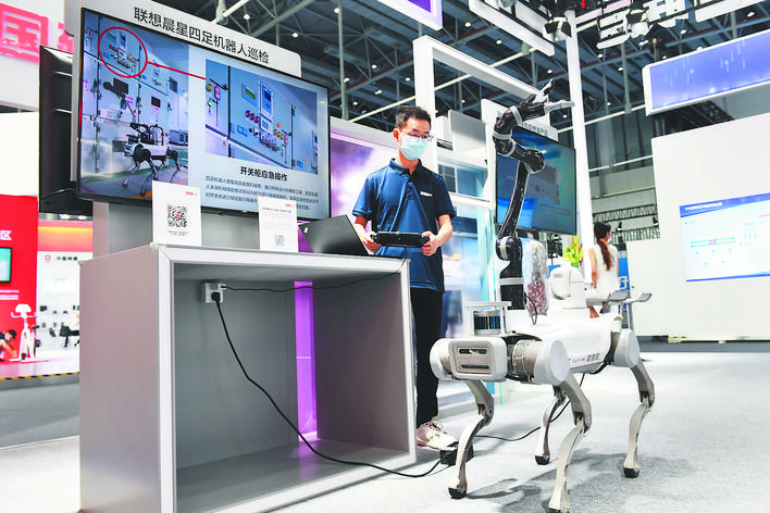 聯(lián)想帶來(lái)的晨星四足電力巡檢機(jī)器人。記者 張大崗 攝