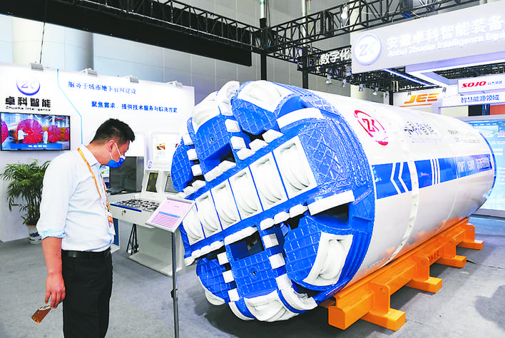 觀眾正在參觀由卓科智能生產(chǎn)的巖石破碎頂管機(jī)。記者 張大崗 攝