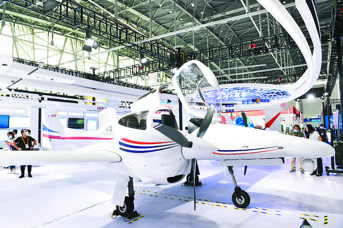 中國(guó)電科展館展出的“戰(zhàn)鴻”空中應(yīng)急指揮機(jī)。記者 張大崗 攝