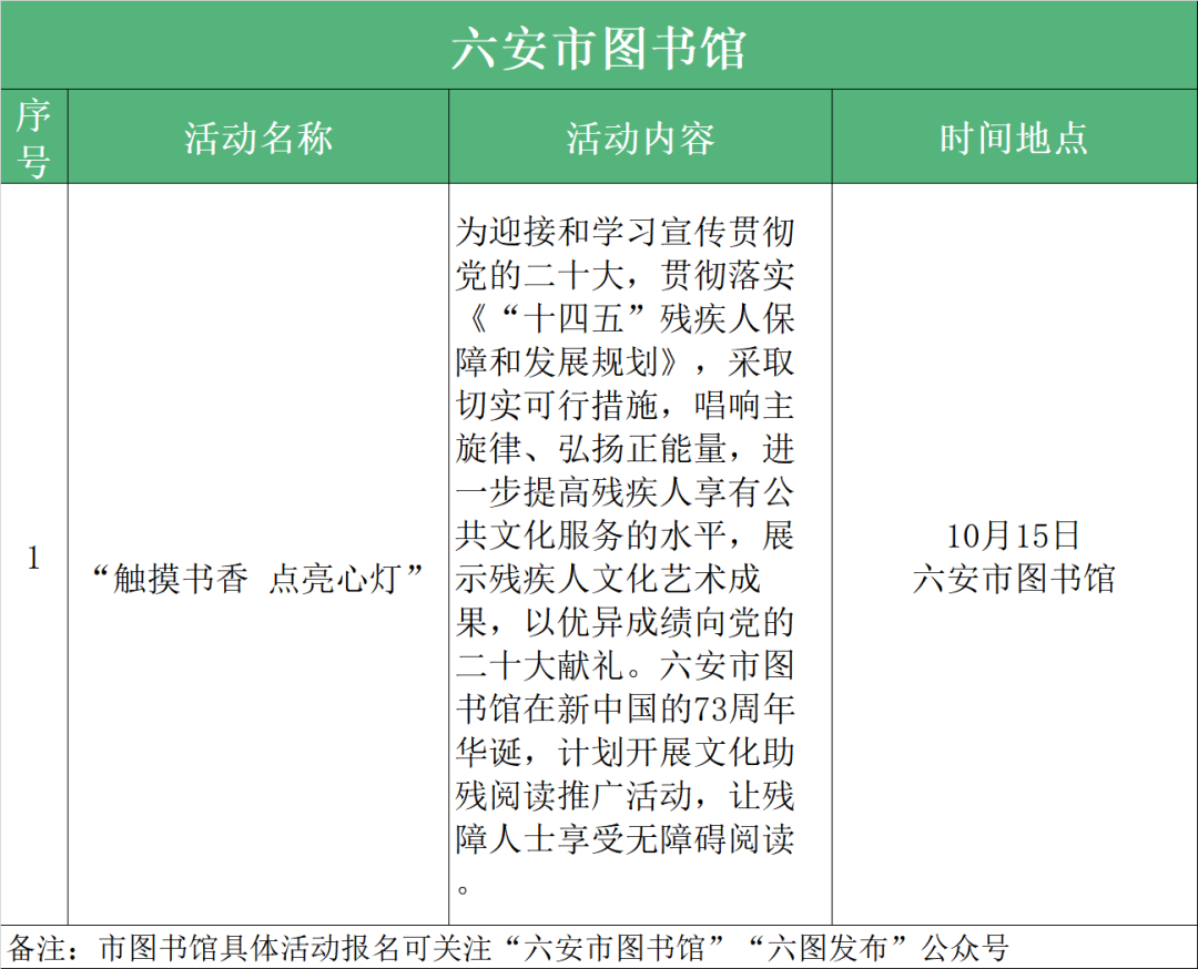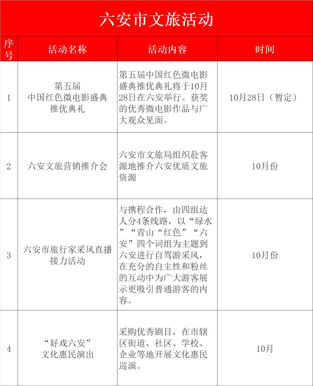 精彩的國慶假期剛過,我們迎來金秋十月,接下來的日子里,六安有著豐富多彩的文旅活動。