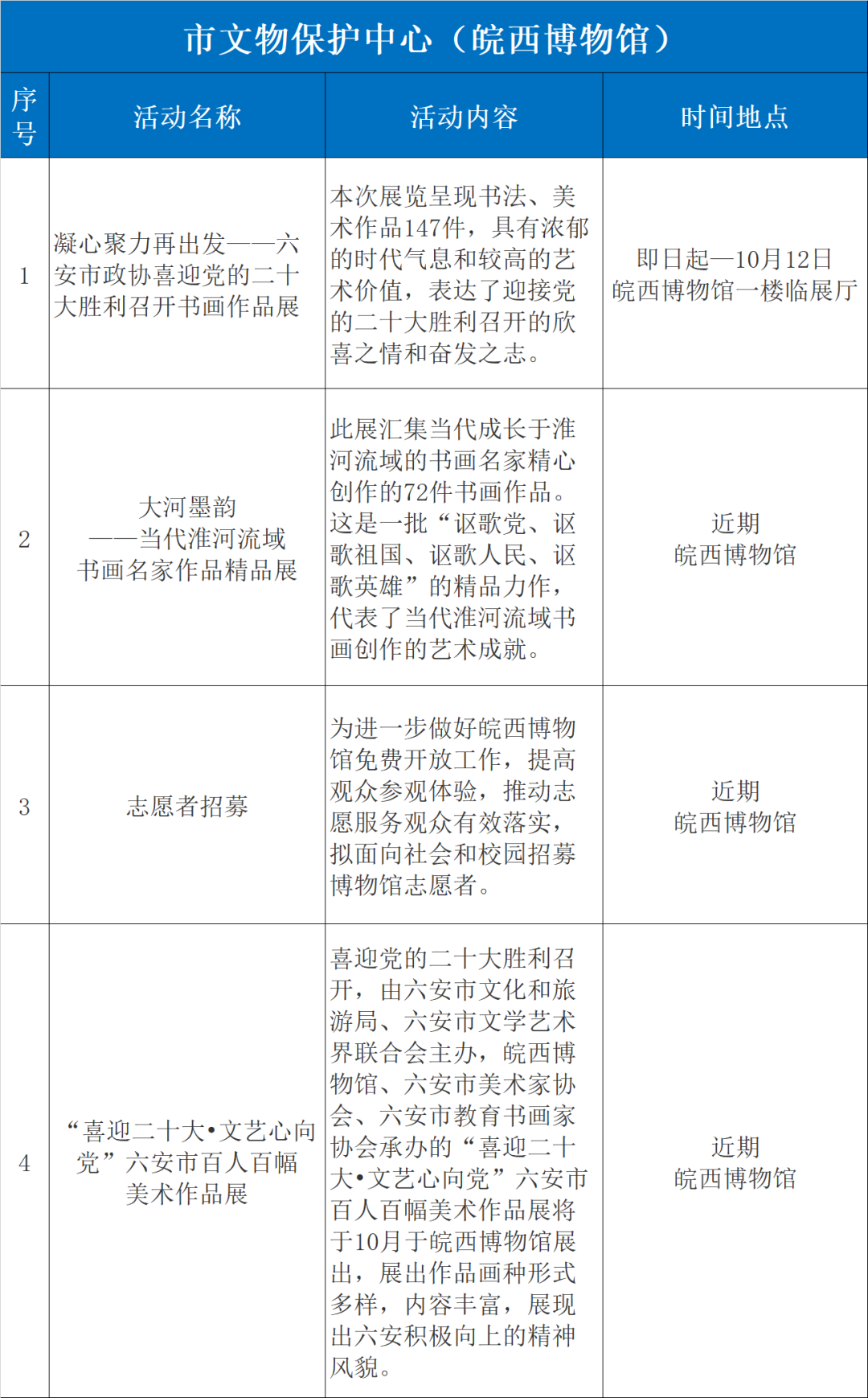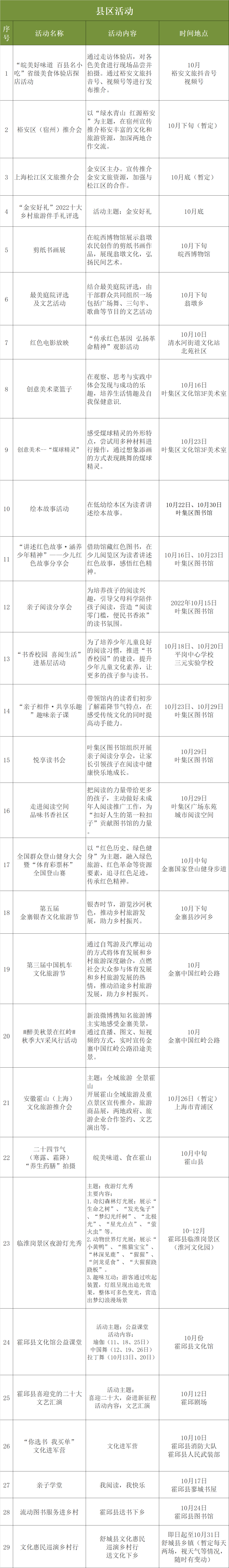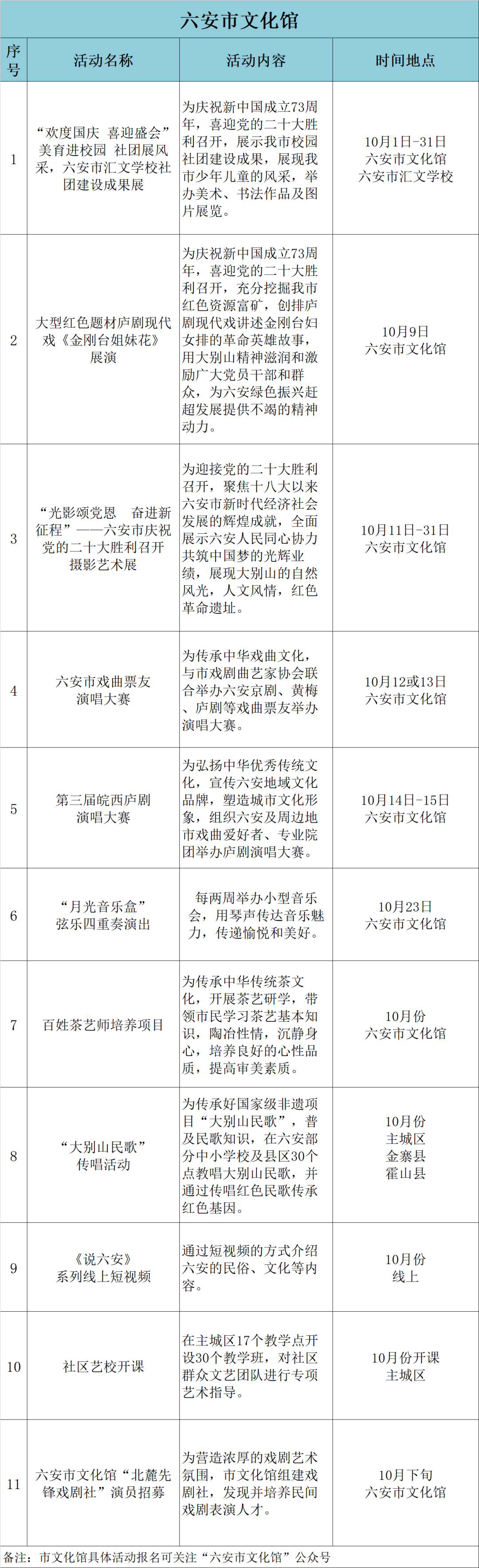 (責(zé)任編輯:君君)精彩的國慶假期剛過,我們迎來金秋十月,接下來的日子里,六安有著豐富多彩的文旅活動。