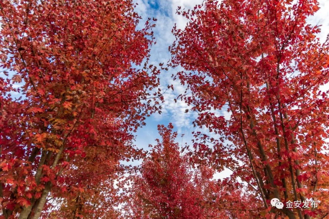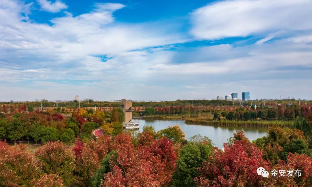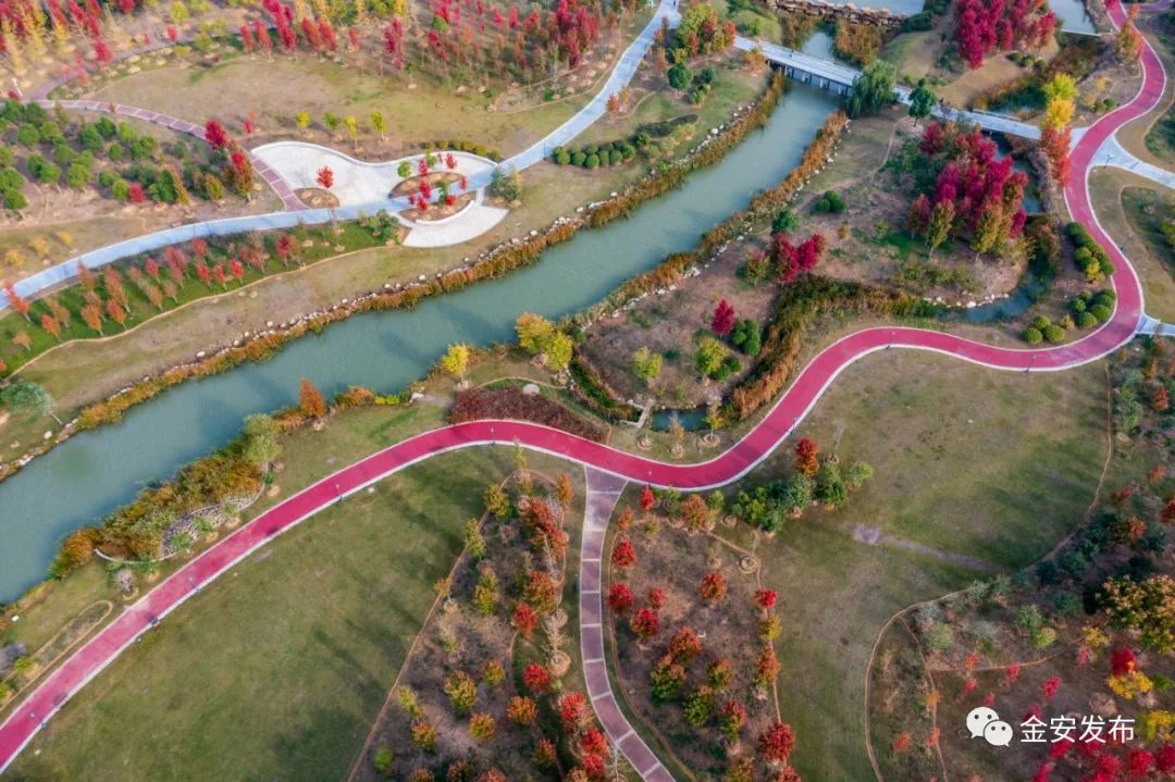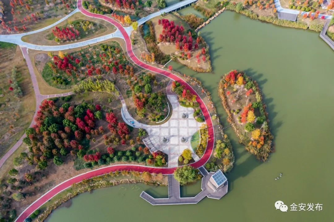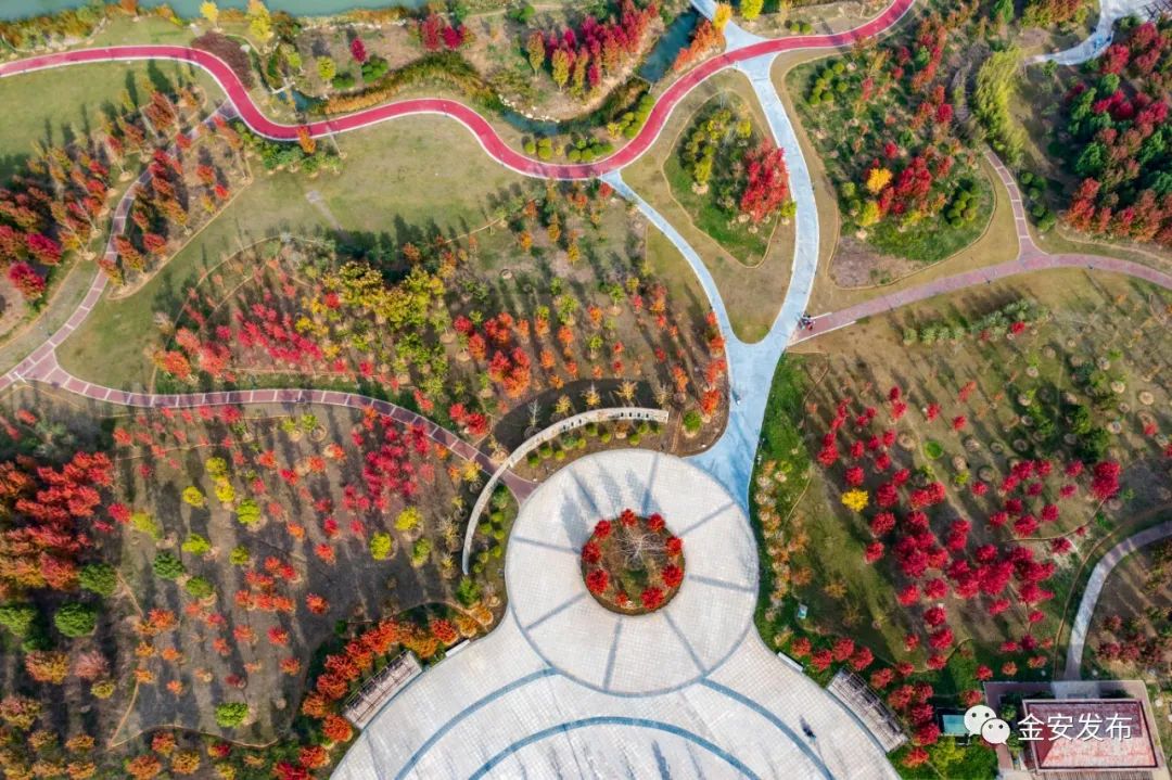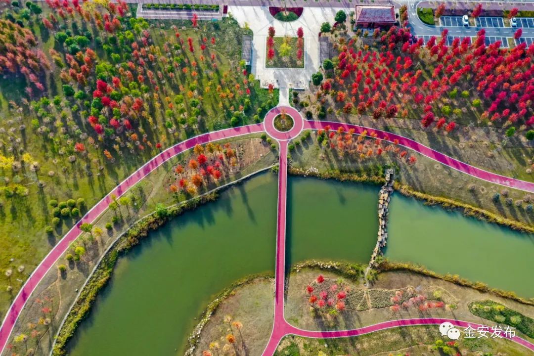 一望無邊的楓葉,如火如荼,濃濃秋意,入眼成畫,披上彩妝的樹木、健身步道、休閑亭臺與人工湖將金安未來城市公園點(diǎn)綴的格外美麗。