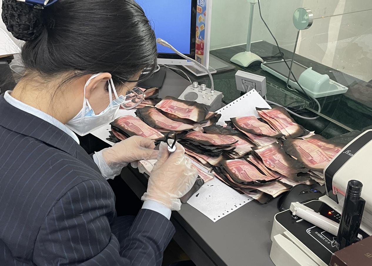 建設銀行黑龍江省分行營業(yè)部立即協(xié)調(diào)部署,開設彈性窗口,緊急抽調(diào)工作人員對“火燒幣”進行清點。由于“火燒幣”經(jīng)過火燒、水淋,100多張紙幣幾乎全部粘連在一起,柜面工作人員只能憑借手工逐張將殘損幣剝離出來,鑒定真?zhèn)魏颓宸謹?shù)量,清理難度高,工作量很大。