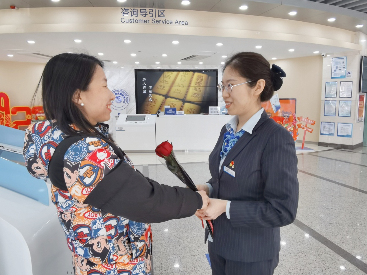 清晨7:30,建設(shè)銀行農(nóng)墾分行營業(yè)部客戶經(jīng)理李嘉瑩與分行工會(huì)負(fù)責(zé)人正將一束束玫瑰花布放在廳堂,“贈(zèng)人玫瑰,手有余香。我們每年都會(huì)在‘三八’節(jié)當(dāng)天向到店女顧客送上一束玫瑰花,以此表達(dá)節(jié)日問候與真摯祝福?!薄敖ㄐ衅綍r(shí)服務(wù)就好,在這樣特殊的節(jié)日,還為我們女性朋友準(zhǔn)備了鮮花,真是太暖心了!”上午第一位到店的張悅妹女士欣喜地表示。