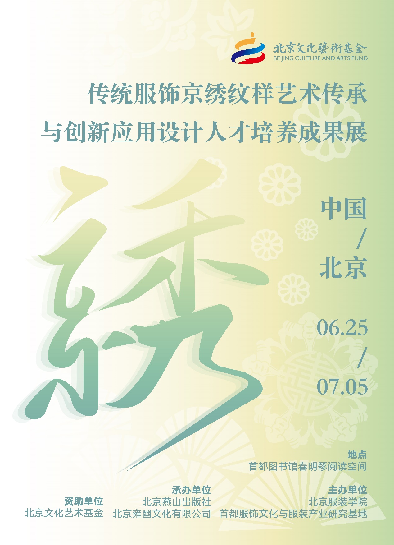 展覽作品由項(xiàng)目學(xué)員、北京服裝學(xué)院研究生創(chuàng)作完成。這一系列藝術(shù)實(shí)踐以優(yōu)秀京繡創(chuàng)新成果潤(rùn)養(yǎng)人民美好生活,充分響應(yīng)了北京文化藝術(shù)基金繁榮文藝創(chuàng)作、促進(jìn)文化交流、培養(yǎng)藝術(shù)人才、推動(dòng)全國文化中心建設(shè)的號(hào)召。