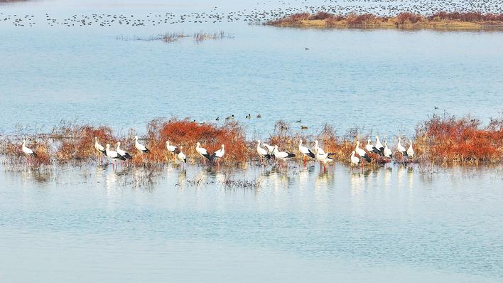 近年來,廬江縣加大力度對(duì)黃陂湖濕地實(shí)施生態(tài)環(huán)境保護(hù),退漁還湖使得4萬(wàn)多畝的濕地生態(tài)環(huán)境得到較大改善。每年冬季,東方白鸛、小天鵝、花臉鴨等大量候鳥都按時(shí)歸來,眾鳥齊飛的壯觀場(chǎng)面,已成為黃陂湖濕地最亮麗的風(fēng)景。