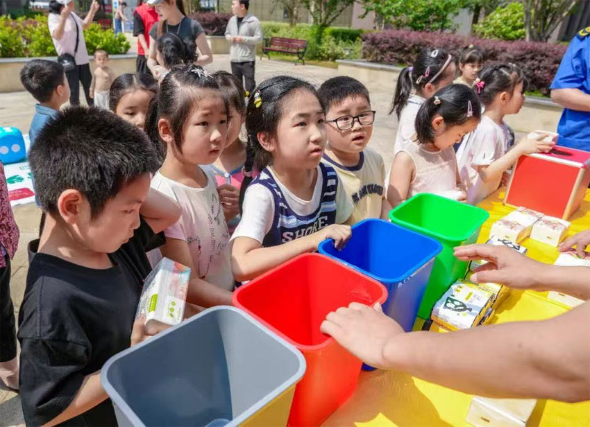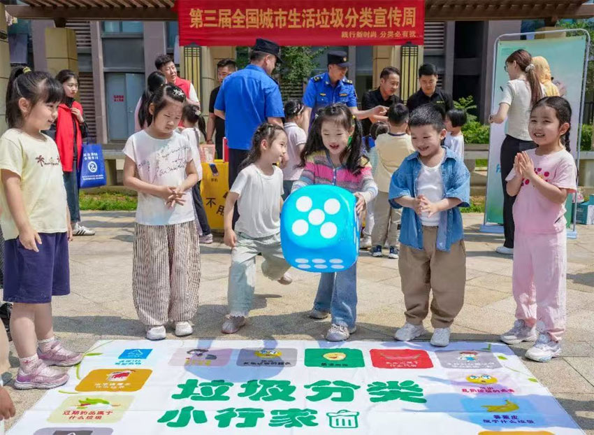小朋友們一邊玩游戲,一邊學(xué)習(xí)垃圾分類知識。