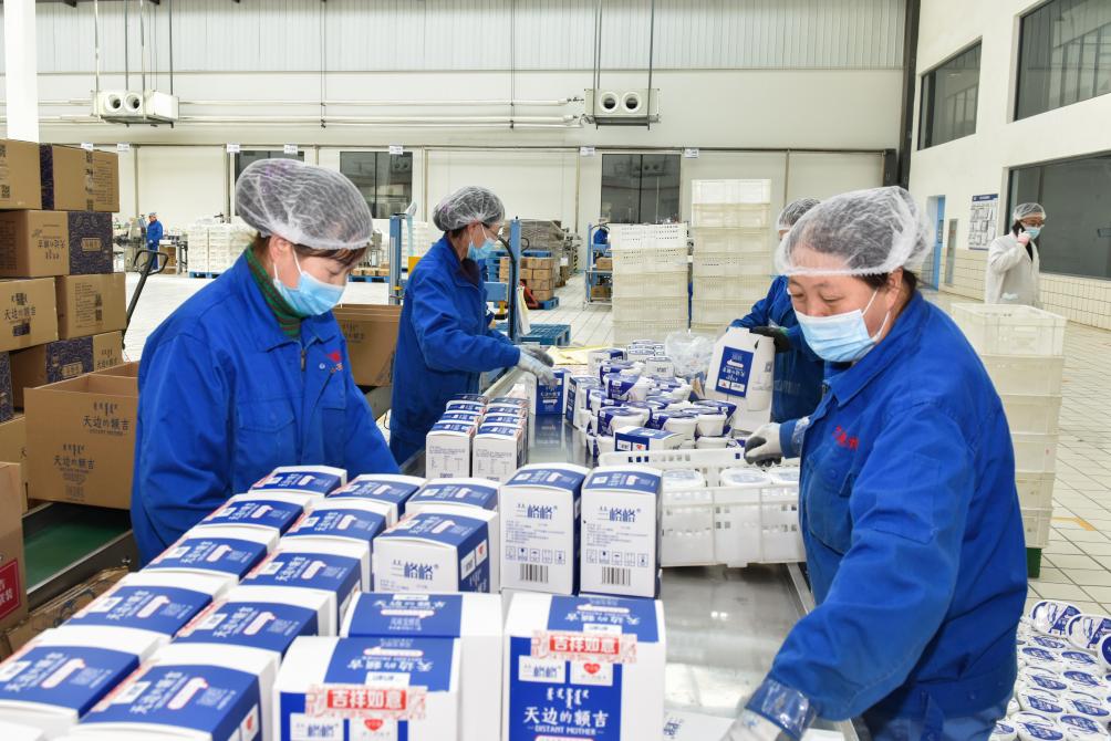 ??工人在內(nèi)蒙古蘭格格乳業(yè)有限公司酸奶生產(chǎn)車間將酸奶產(chǎn)品裝箱。(受訪者供圖)