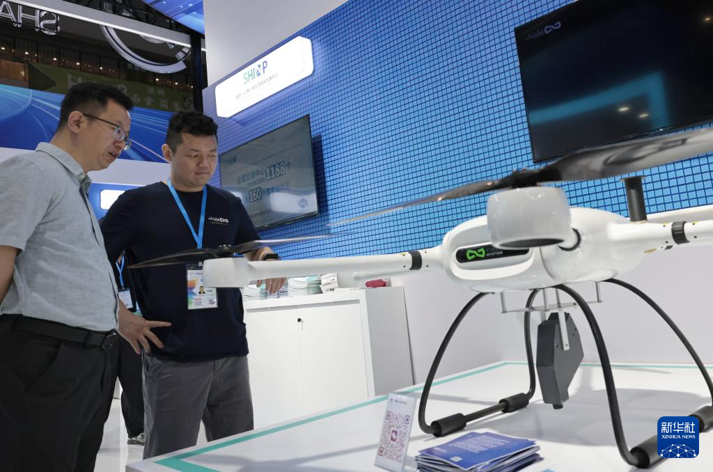 6月11日,參觀者在一個裝備高光譜成像儀系統(tǒng)的無人機旁交流討論。