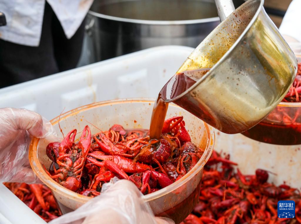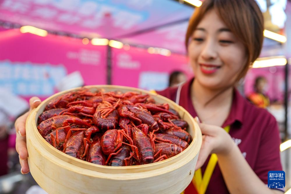 6月12日,工作人員在活動(dòng)現(xiàn)場展示小龍蝦美食。