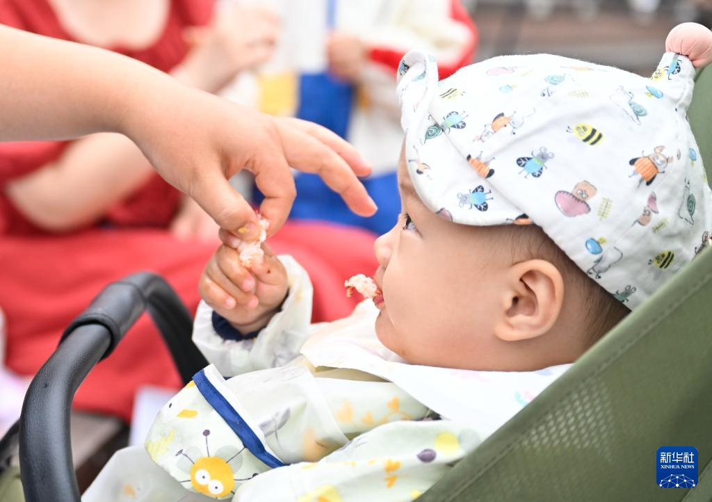 6月12日,一名家長在龍蝦宴現(xiàn)場給孩子試吃小龍蝦。