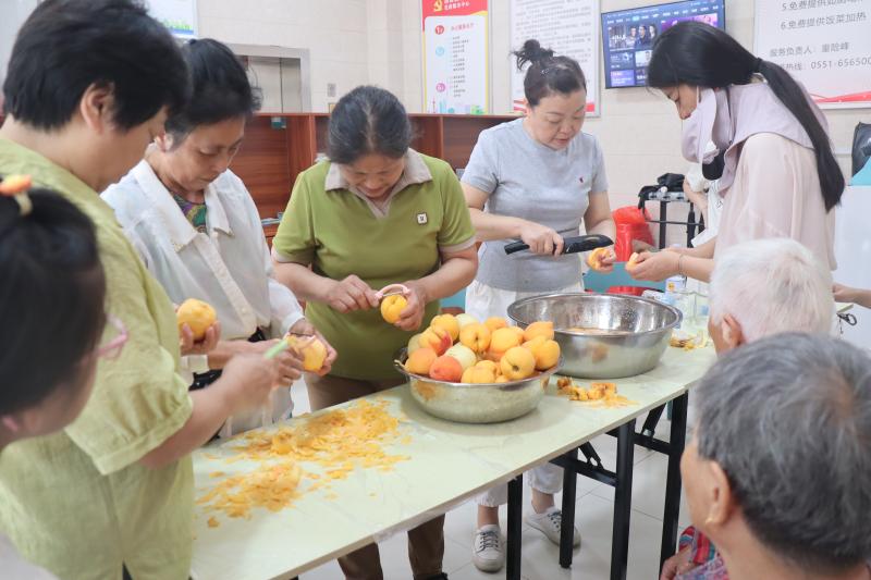 活動伊始,工作人員現(xiàn)場演示黃桃罐頭制作全流程:從清洗消毒、刀具安全使用到果肉處理、低糖配方熬煮最后無菌灌裝密封,每個環(huán)節(jié)都強調(diào)衛(wèi)生規(guī)范。居民們戴上手套、圍裙,在志愿者指導(dǎo)下分組協(xié)作。削桃、切塊、蒸煮、裝罐……現(xiàn)場果香四溢,歡聲笑語不斷?!白约鹤龅墓揞^用料實在、糖分可控,孩子吃得放心!”帶著孫女參與的李阿姨笑著展示貼好標(biāo)簽的成品。不少居民表示,活動既學(xué)到了手藝,又拉近了鄰里距離?;顒雍?,社區(qū)工作人員為轄區(qū)行動不便的老人送上制作好的罐頭,老人臉上洋溢著喜悅。