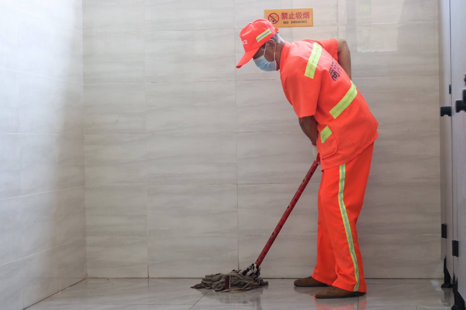 上午10點(diǎn)時(shí),此時(shí)的空氣雖未完全升溫,但密閉的空間里依然彌漫著悶熱與潮濕。濱河公廁的劉大爺正熟練地噴灑清潔劑,擦拭鏡面、洗手臺(tái)、第三衛(wèi)生間馬桶,拖地,清理蹲坑......仔細(xì)清理著每一個(gè)角落。隨著太陽逐漸升高,室外溫度突破35℃,公廁內(nèi)更加悶熱,瓷磚反射著熱氣,汗水順著他的脖頸不斷滑落,模糊了眼睛,他騰出衣角匆匆擦拭,又繼續(xù)投入到清潔工作中。高溫不僅考驗(yàn)著他們的體力,更挑戰(zhàn)著心理承受力。公廁內(nèi)異味在高溫下愈發(fā)濃烈,蚊蟲也在高溫中肆意飛舞,可他們卻要在這樣的環(huán)境中連續(xù)工作八小時(shí)甚至更久,他們沒有節(jié)假、沒有周末,即便如此,他們依然保持著公廁的窗明幾凈,地面干爽無污漬。
