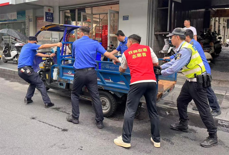 本次行動(dòng)以五河路沿線和雙崗老街為核心區(qū)域。社區(qū)工作人員與城管、交警部門緊密協(xié)作,形成整治合力。在專業(yè)人員指導(dǎo)下,各方分工明確、行動(dòng)有序,對(duì)車主未在場(chǎng)或經(jīng)多次勸導(dǎo)仍拒不駛離的違停三輪車,予以依法拖移,并安全存放至指定停車場(chǎng)。