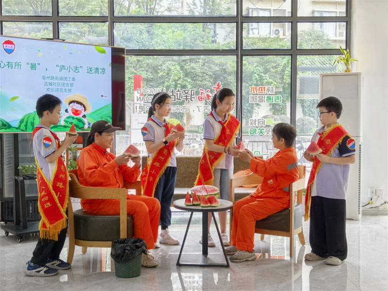 現(xiàn)場,20多位廬小志化身“西瓜攤主”別出心裁,通過趣味游戲與愛心售賣相結(jié)合的方式,為本地瓜農(nóng)解決滯銷難題,同時走上街頭、走進(jìn)工會驛站向環(huán)衛(wèi)工人、外賣騎手等新就業(yè)群體傳遞夏日清涼。