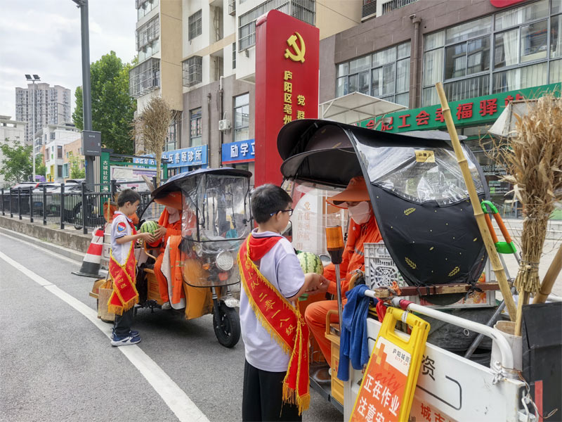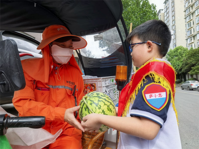 結(jié)束內(nèi)場的公益售賣后,8名“廬小志”代表將西瓜、礦泉水等物資,親手送到環(huán)衛(wèi)工人和外賣騎手手中。“原來我的零花錢能變成別人的清涼,太有意義了!”參與慰問的王同學(xué)感慨道。