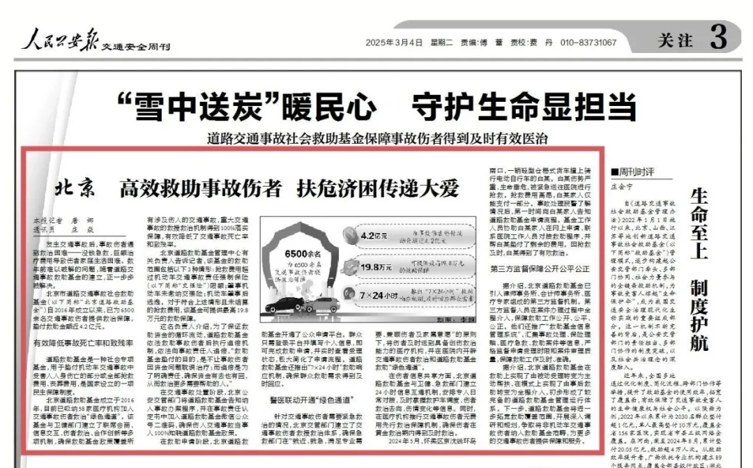 《人民公安報》刊發(fā)北京道路救助基金文章:高效救助事故傷者 扶危濟困傳遞大愛