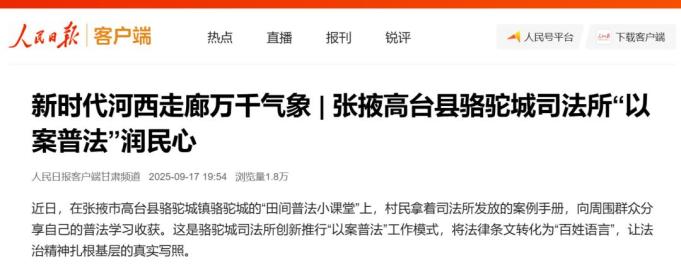 9月17日,人民日報客戶端甘肅頻道發(fā)布了甘肅省司法廳推薦的工作新聞稿件——《新時代河西走廊萬千氣象 |張掖高臺縣駱駝城司法所“以案普法”潤民心》,現(xiàn)予以轉(zhuǎn)載。