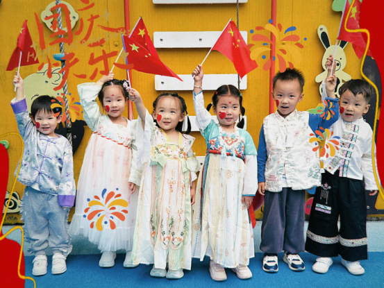 海棠園全體幼兒身穿民族服飾,共同參與國慶中秋雙節(jié)同慶主題活動(dòng)。小班的寶貝們?cè)诶蠋煹囊龑?dǎo)下,認(rèn)識(shí)五星紅旗,了解了國旗象征的意義。孩子們手舉小紅旗,或俏皮地比出愛心,或深情地?fù)肀А皣臁保粡垙垹N爛的笑臉在國旗的映襯下格外可愛。