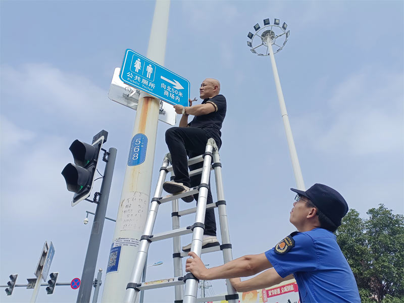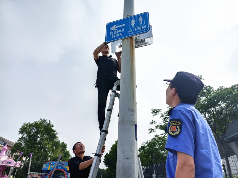 10月9日上午,在北二環(huán)與四里河路交叉口,施工人員將一塊掉漆褪色的舊公廁指示牌卸下,換上了嶄新的雙面居中抱箍式導(dǎo)視牌?!靶屡谱佑至劣智宄?,不光找?guī)奖懔?,看著也比以前結(jié)實(shí)安全!”家住附近的市民李女士駐足查看時(shí)連連稱贊。